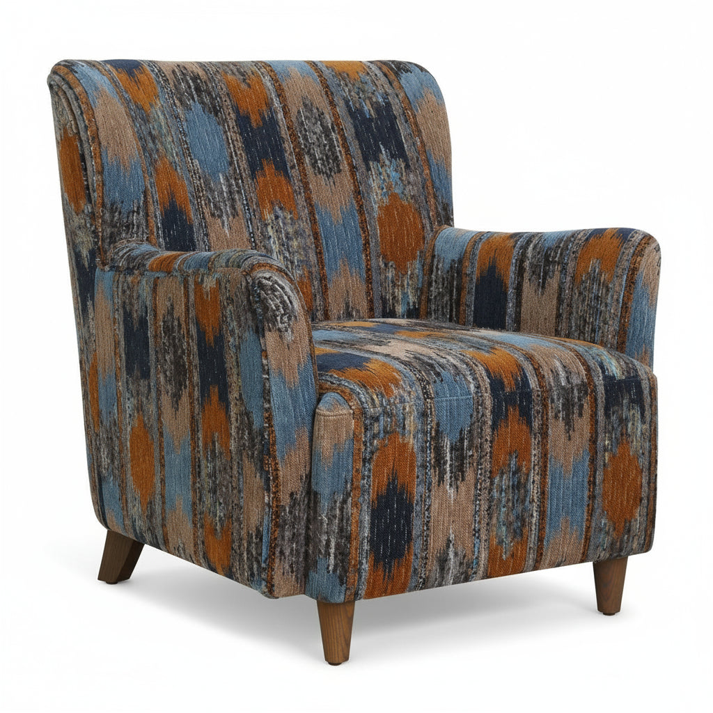 Combining timeless design with artistic flair, this classic armchair is upholstered in a striking ikat chenille in shades of sapphire, rust and spa blue. Resting on solid wood tapered legs finished in light walnut.