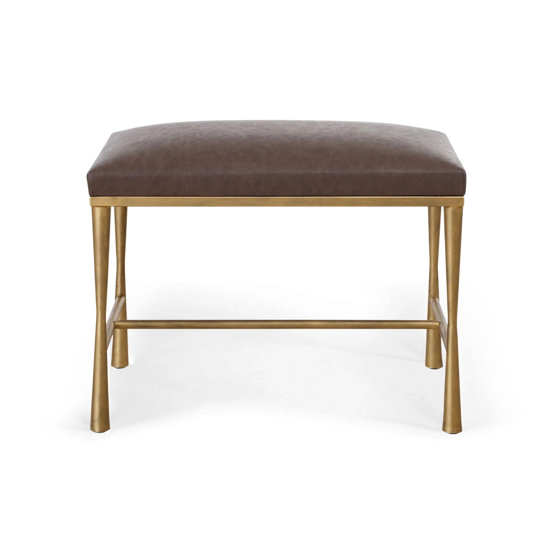 An elegant and versatile accent bench, showcasing distressed cocoa faux leather and a strong iron base in a lightly antiqued gold finish, making it a timeless addition to any space.