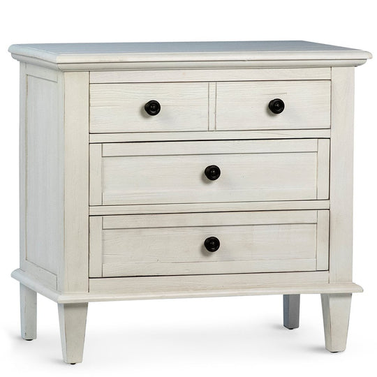 Shabby Chic-spirited with classic style. Made from white wash finished acacia, this roomy three-drawer nightstand brings extra storage space to the bedside.