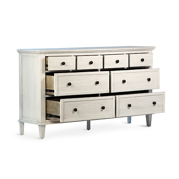 Shabby Chic-spirited with classic style. Made from white wash finished acacia, this stately eight-drawer dresser offers ample bedroom storage.