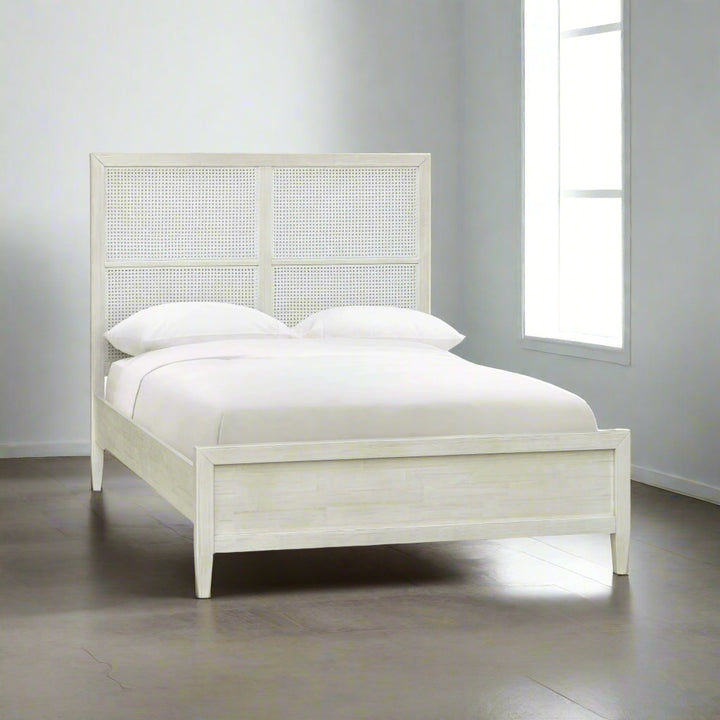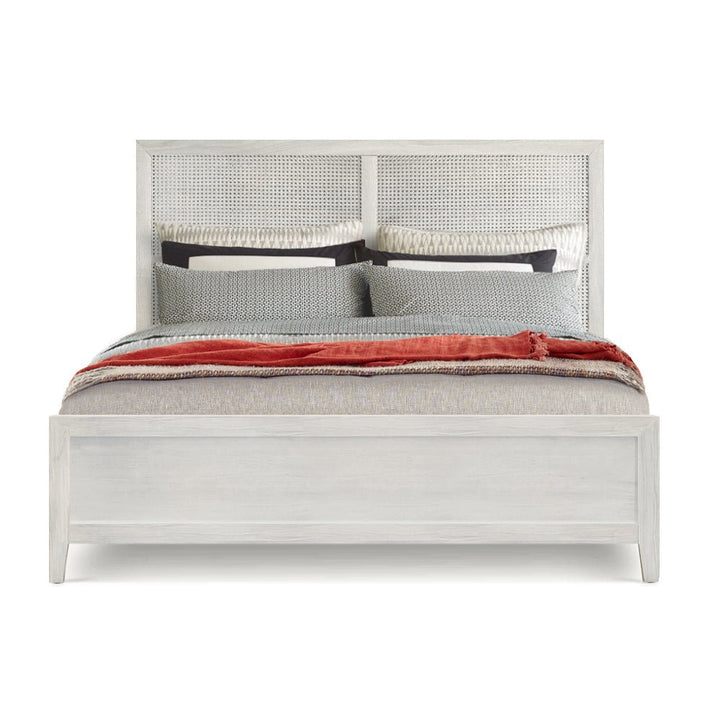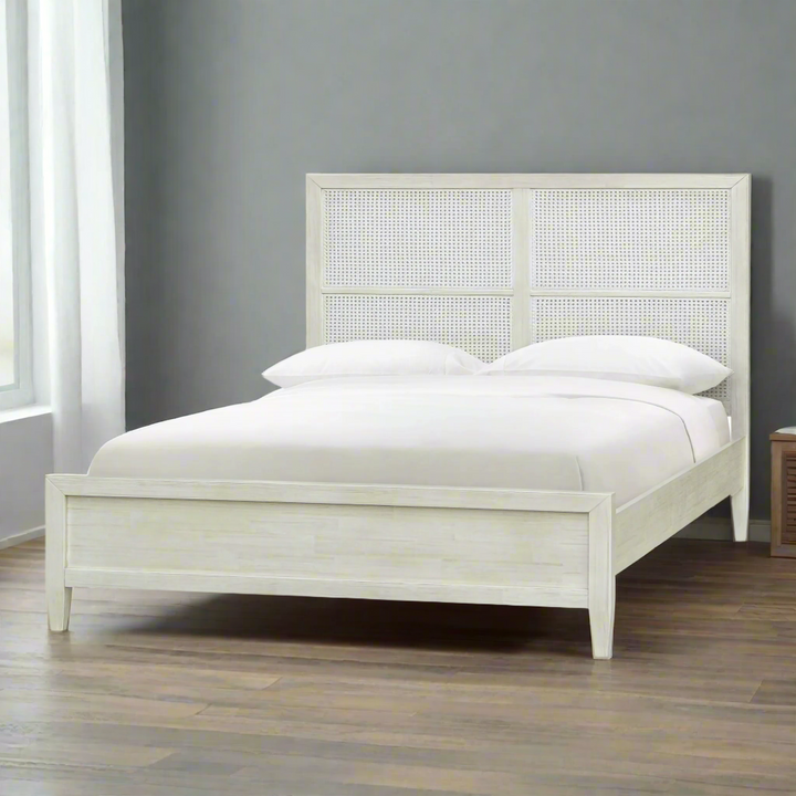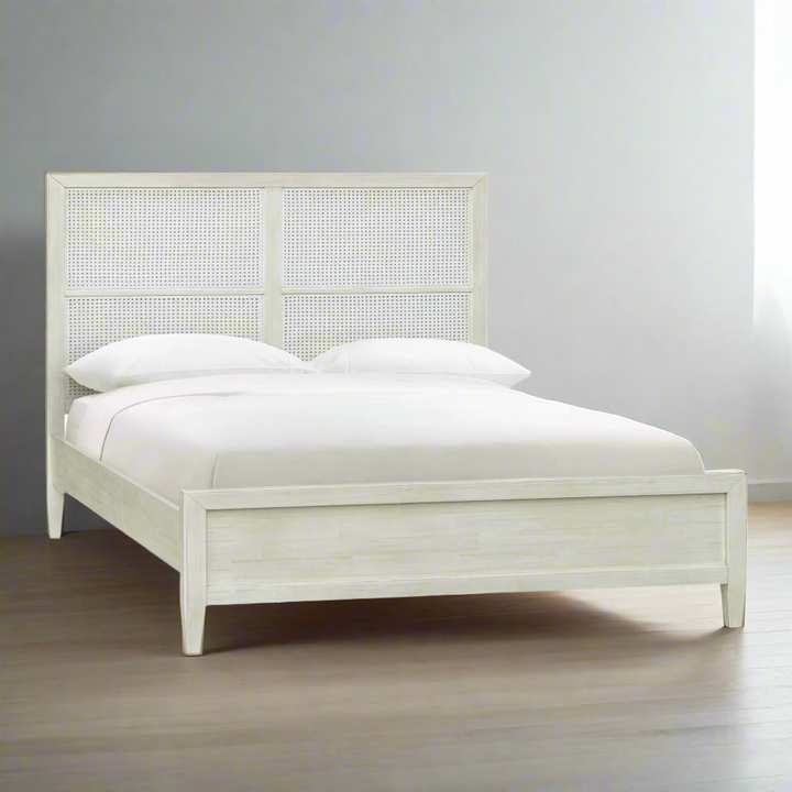 Shabby Chic-spirited while beautifully on trend. White washed acacia frames circle cane panels bringing a fresh, textural look to the bedroom.