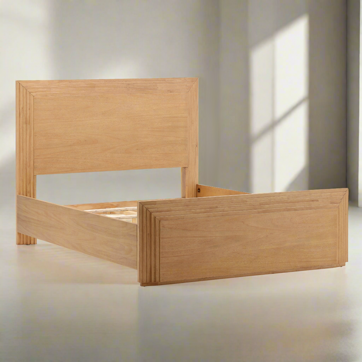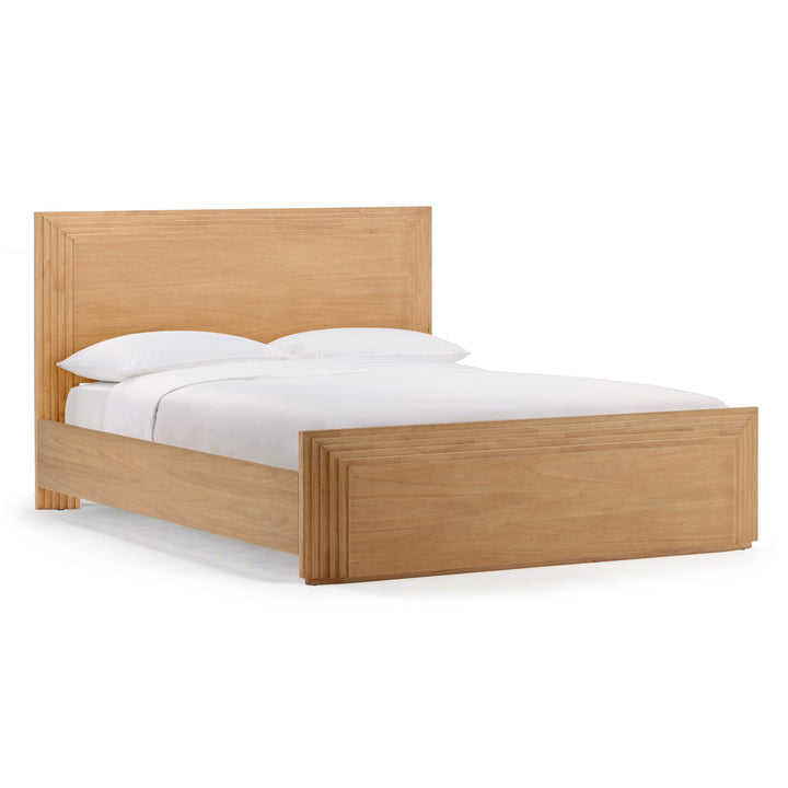 A simply shaped bed of natural-finished oak offers a handcrafted look inspired by Art Deco midcentury design.