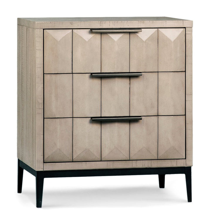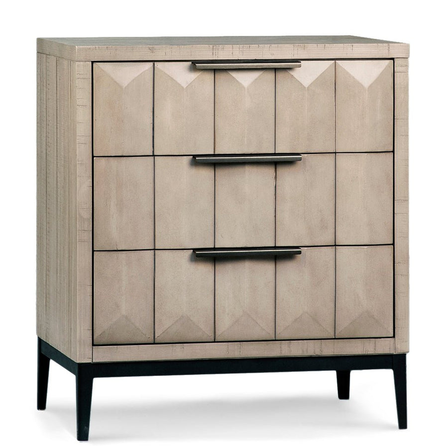 Stately style. Geometric pine wood panels in a light grey wash brings a fresh textural look to bedside storage.