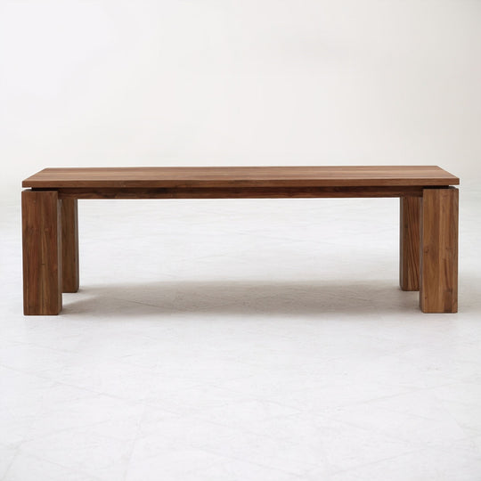 Structured lines, chunky legs and a medium wood finish complete this rectangular dining table made from reclaimed teak wood. Seats eight comfortably.