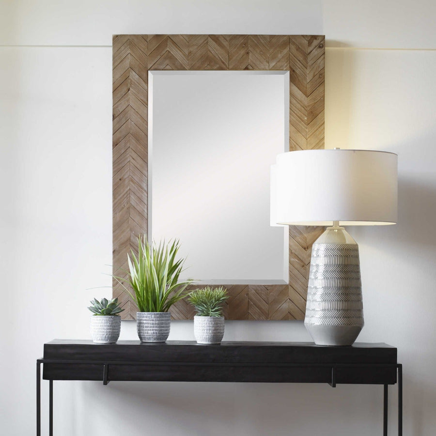 This mirror features a chevron patterned, natural pine wood frame finished with a light gray glaze. Mirror has a generous 1 1/4" bevel.