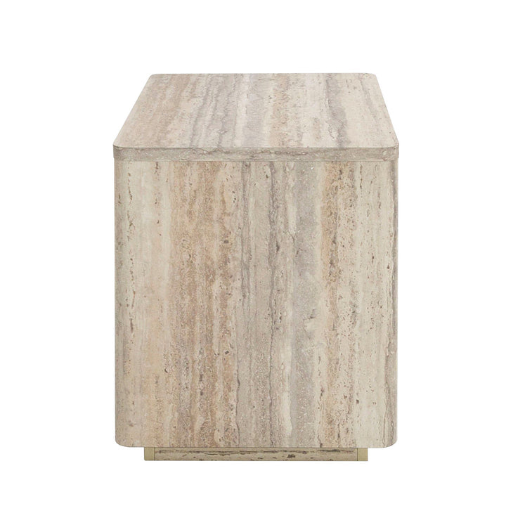 A fusion of modern design and timeless appeal. With a soft-close drawer accented by a subtle gold handle, an open shelf for effortless storage, and a flawless faux travertine finish, this piece delivers quiet sophistication to any space.
