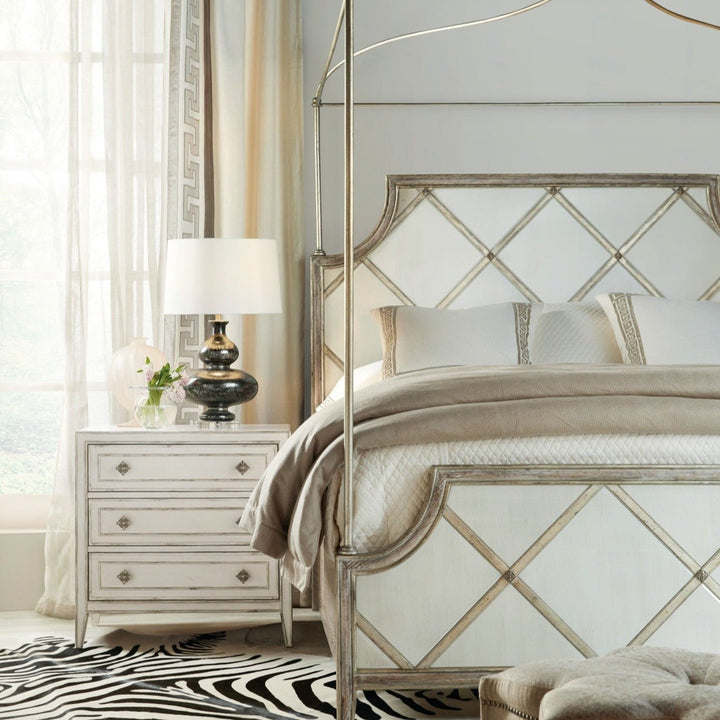 Just add candlelight. With clean lines and a creamy white finish accented with champagne and silver tipping, the Anastasie nightstand is refined elegance with a whisper of Hollywood glamour.
