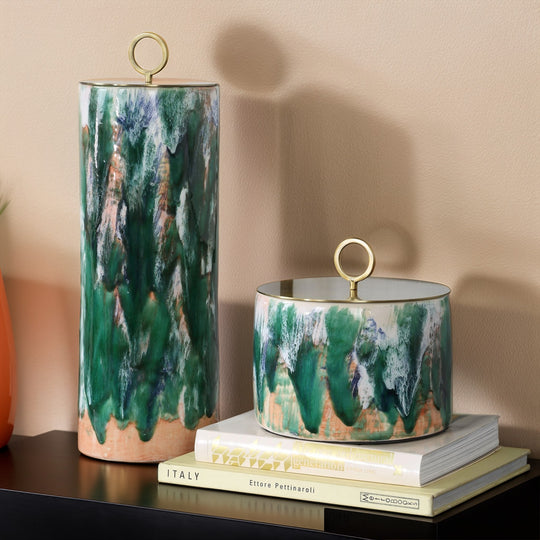 Infuse your living space with personality while maintaining practicality with our set of two abstract painted ceramic containers. Vibrant greens, pinks, and whites come to life in an energetic, artistic style, complemented by modern metal lids and convenient ring handles. These containers provide functional storage while adding a touch of aesthetic appeal to your home.