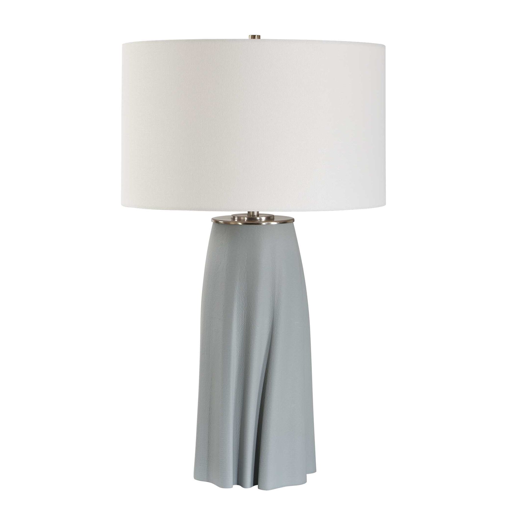 The Cover Up Table Lamp Features A Gracefully Sculpted Ceramic Base, Reminiscent Of Softly Draped Fabric, In Muted Light Blue And Accented With Antique Brass Plated Details. The Round Hardback Drum Shade Is Covered In A Crisp White Linen Fabric.
