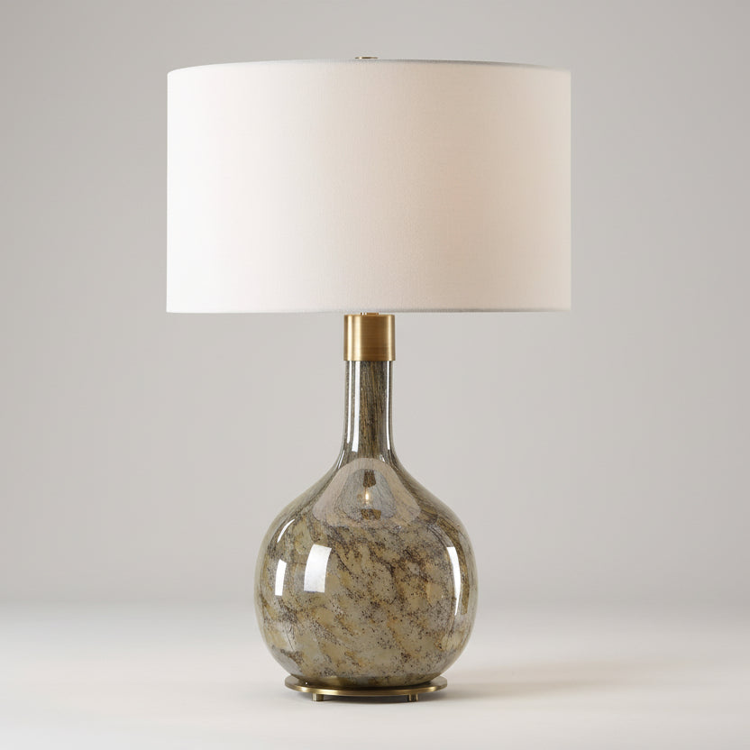 Featuring a seeded glass construction in rich brown hues complemented by smoky gray tones, this table lamp delivers sophisticated ambient lighting. Antique brass plating adds refined metallic accents throughout the design. The crisp white linen drum shade provides a clean contrast while diffusing light evenly across your space. An expertly crafted piece that elevates any interior setting with understated elegance and functional style.