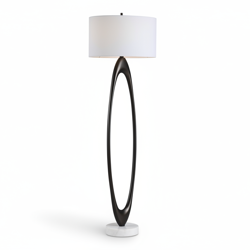 This striking floor lamp features a distinctive elongated oval base in deep bronze tones, anchored by a substantial round white marble foot showcasing natural veining. Antique brass-plated accents enhance the sophisticated hardware details. The lamp is topped with a classic hardback drum shade wrapped in crisp white linen, creating a refined focal point that bridges traditional and contemporary design sensibilities.