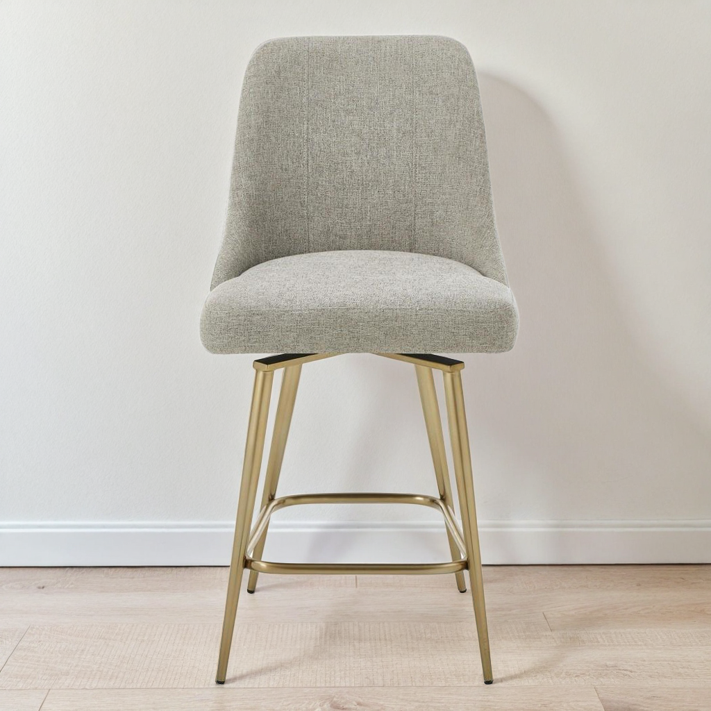 The Bramwell Counter Stool combines softly angled contemporary design with slender, brushed gold metal legs. It includes a swivel return seat upholstered in a durable heathered taupe polyester fabric, offering both style and comfort.