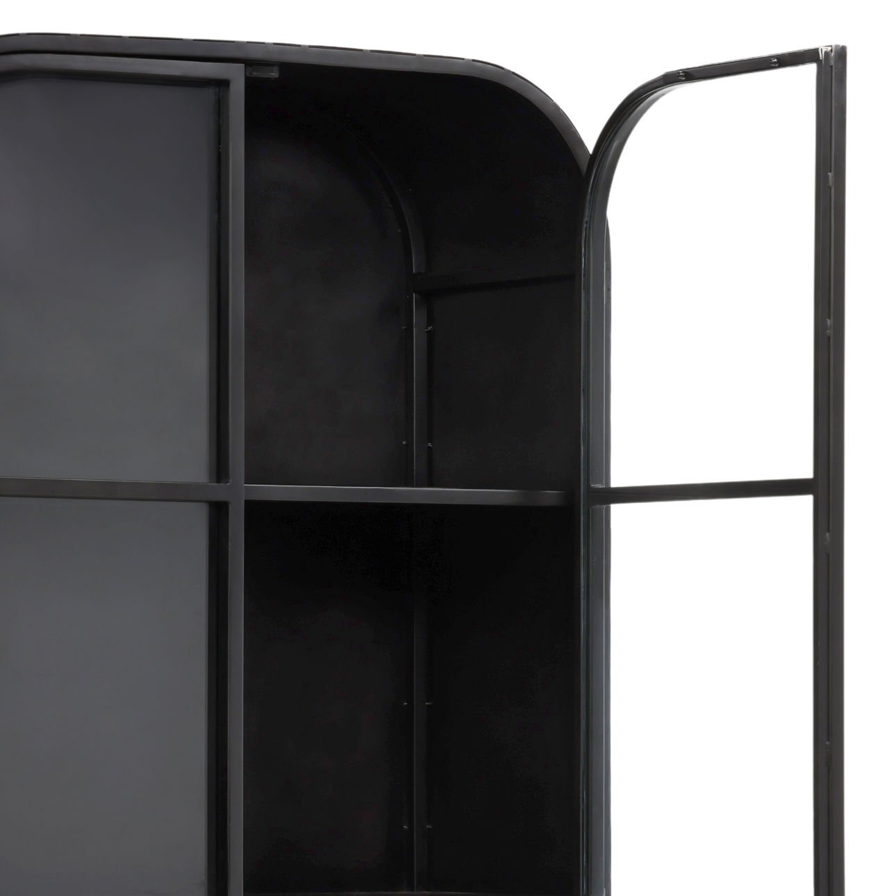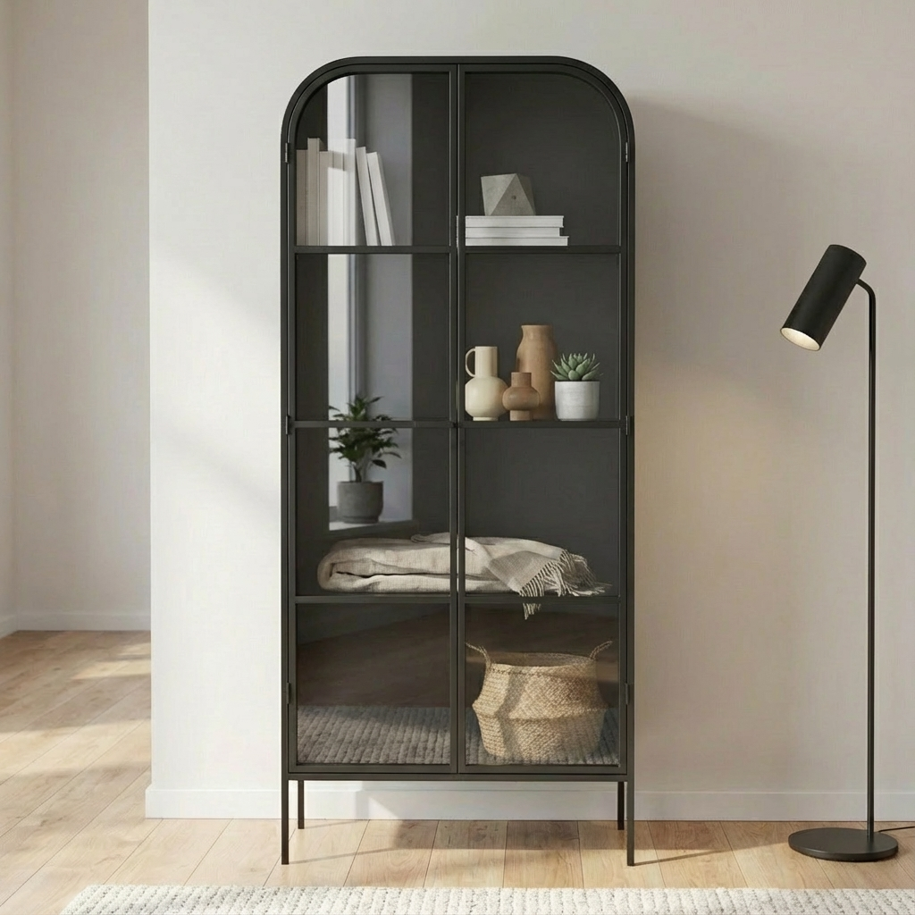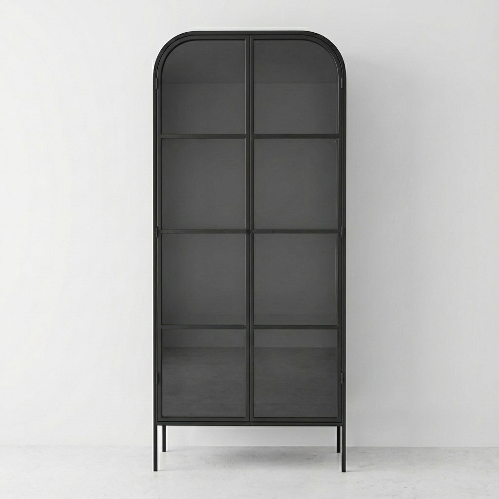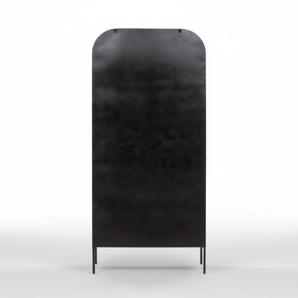 Exhibit your curated selections—from spirits and volumes to cherished mementos—within generously proportioned shelving. Constructed from solid iron stock and finished in a subtle matte black, this architectural piece delivers industrial character while providing sophisticated display functionality for discerning collectors.