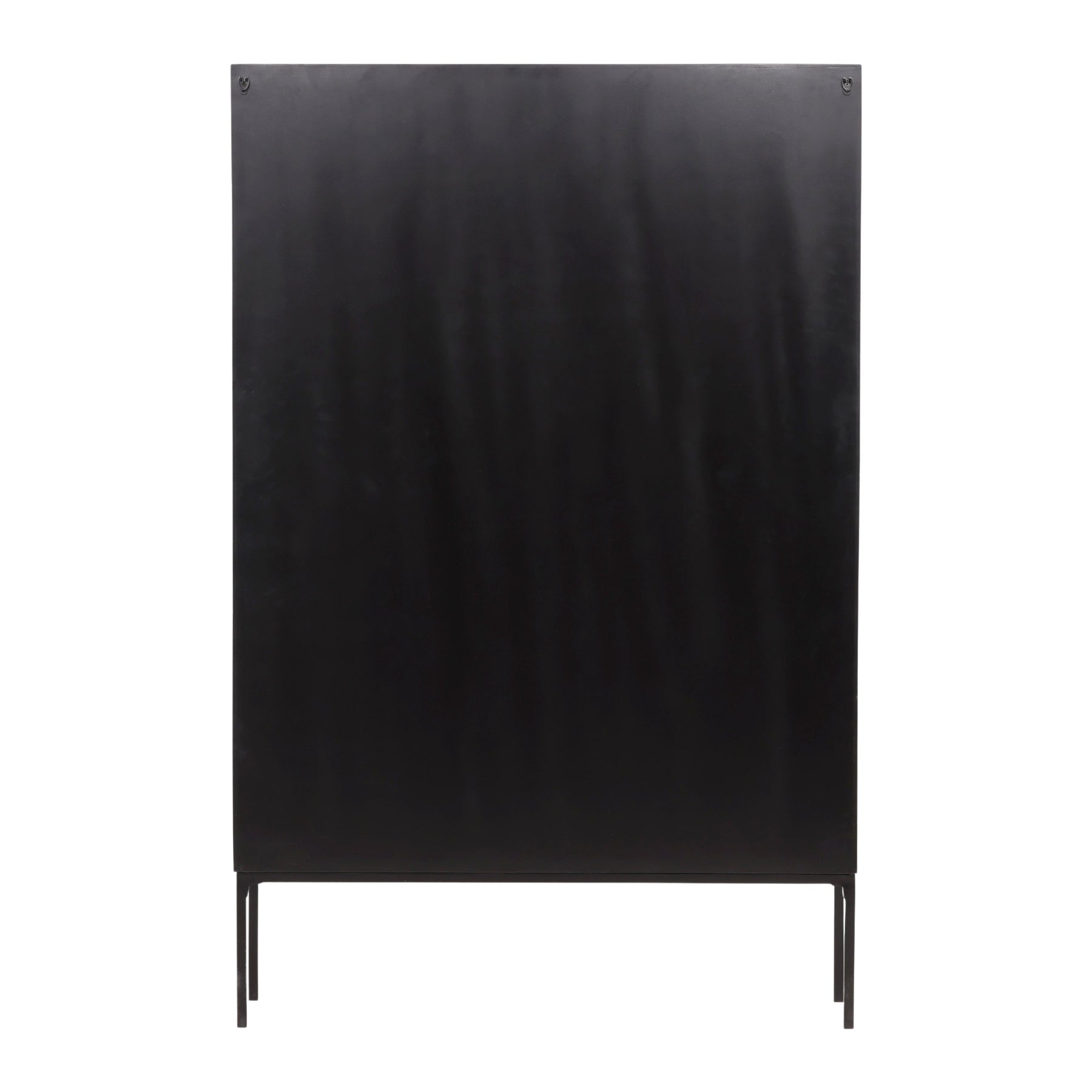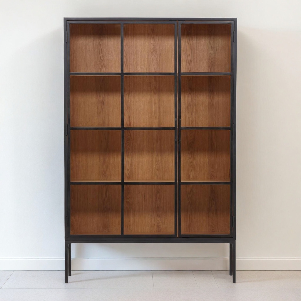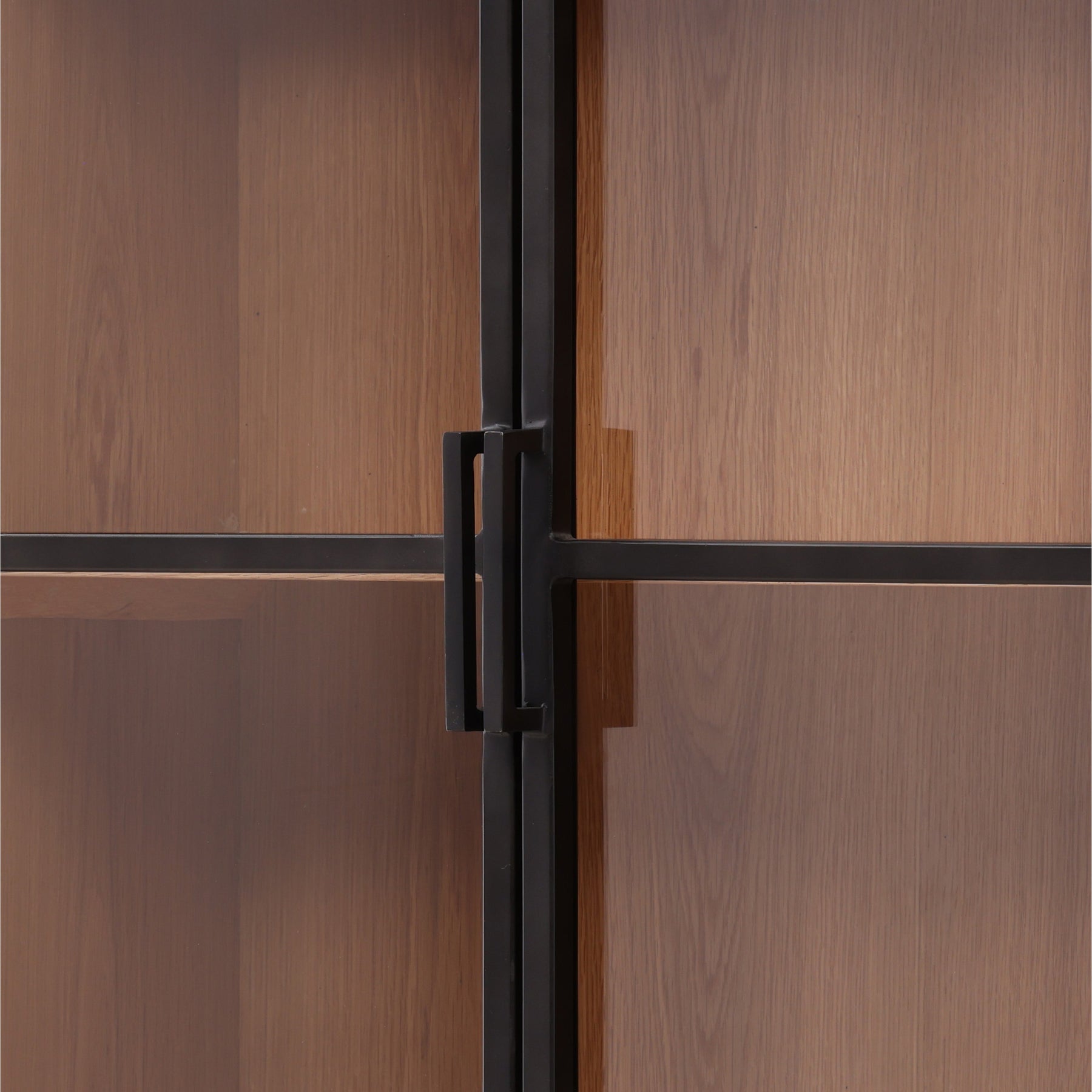 This modern industrial style two-door cabinet framed in black iron with natural oak veneer backing brings an elevated look to any space. Glass doors offers a seamless setting for storage or display.