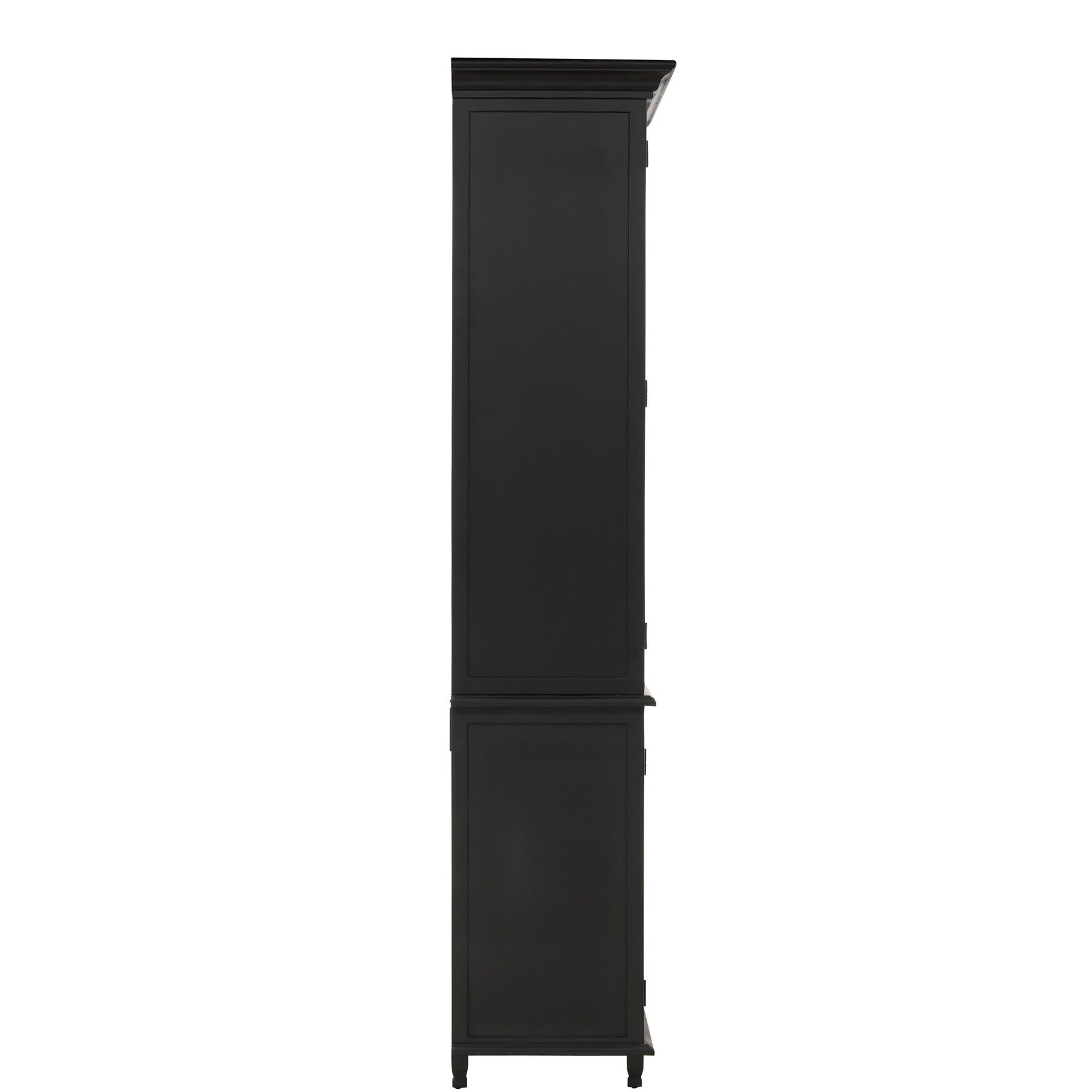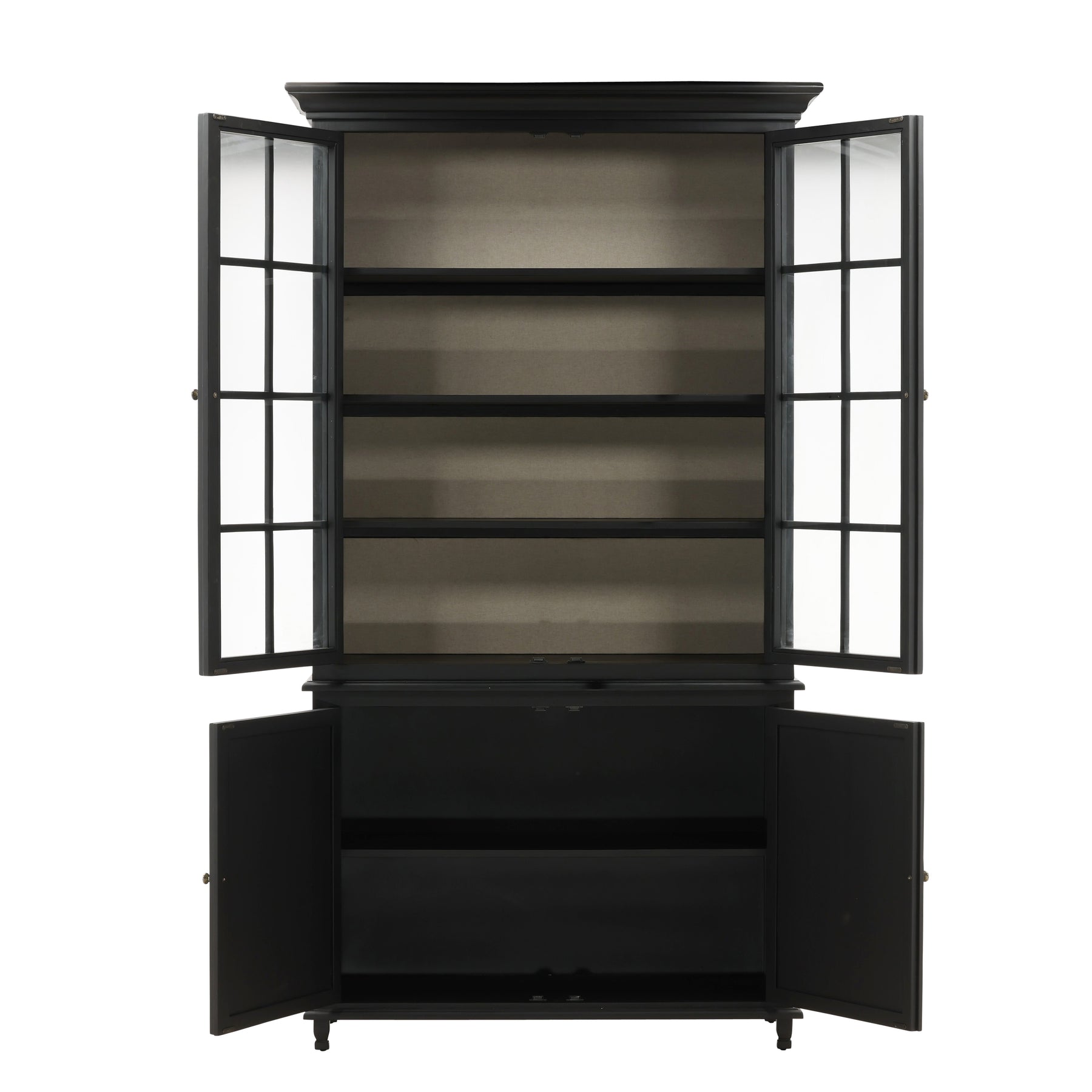 Large, traditional cabinetry of black-finished pine wood brings a timeless look — and plenty of storage — to any room in the house. Glass doors with natural linen fabric backing modernize this heritage-inspired piece, so you can style your favorite books and belongings. A roomy lower two door cabinet create endless storage possibilities for your space.