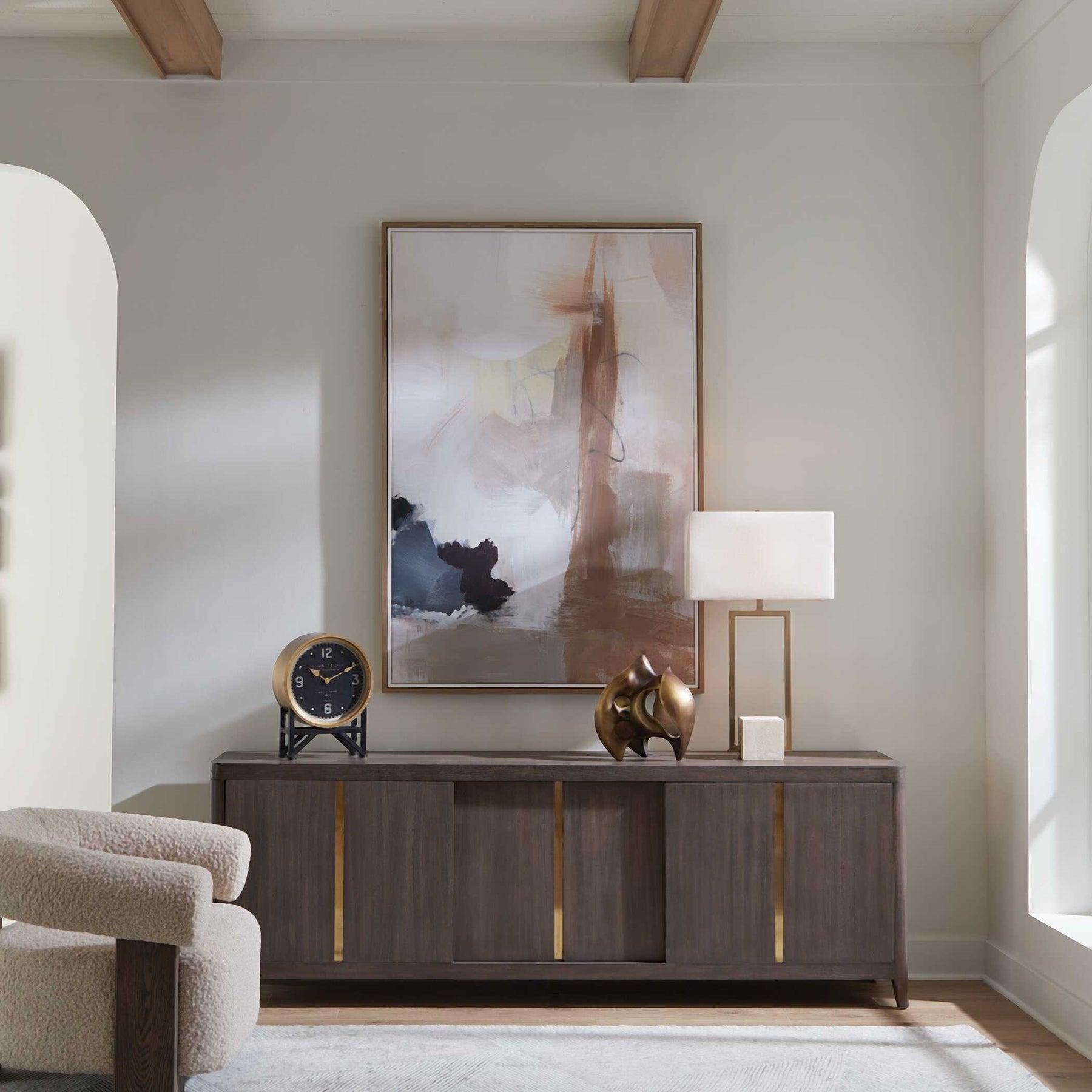 Bluster is a captivating abstract piece that creates cohesion between warm tones and striking pops of plum, blue, pale yellow. A light oak and white double gallery frame encases the artwork.