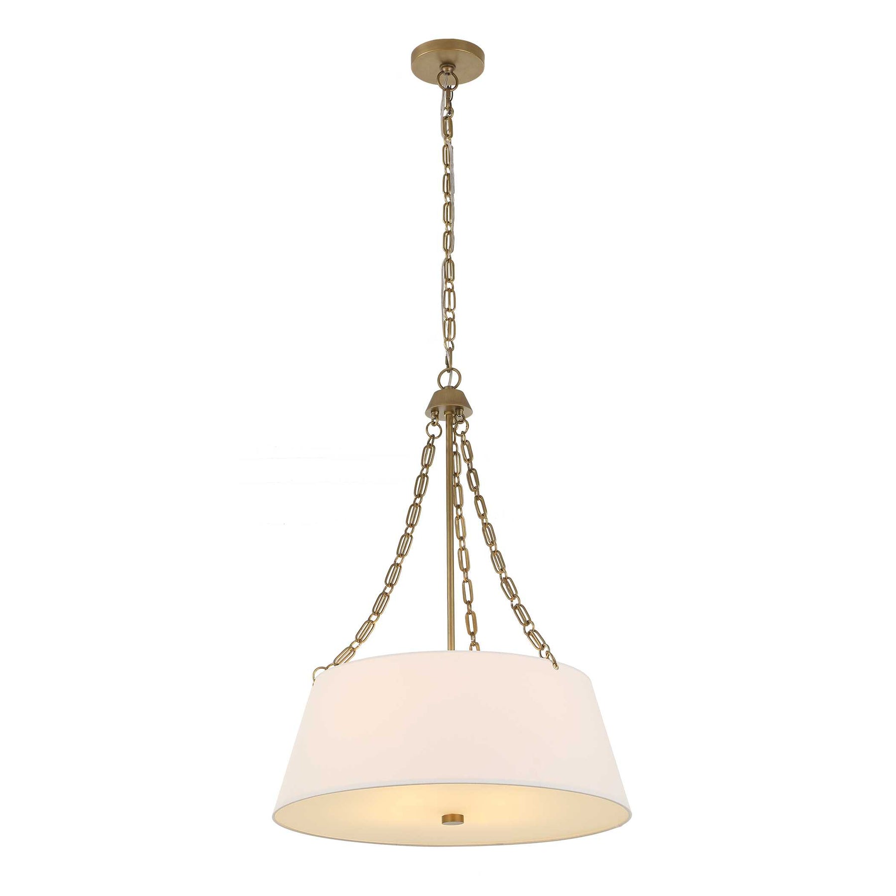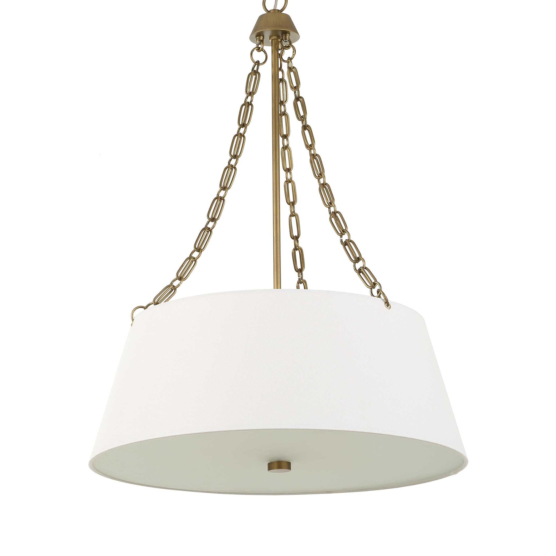 The Drum Pendant light showcases a White Linen Shade enhanced with bespoke Double Oval Link Chain accents, finished in Matte Brushed Gold, and complemented by a lower White Glass Diffuser.