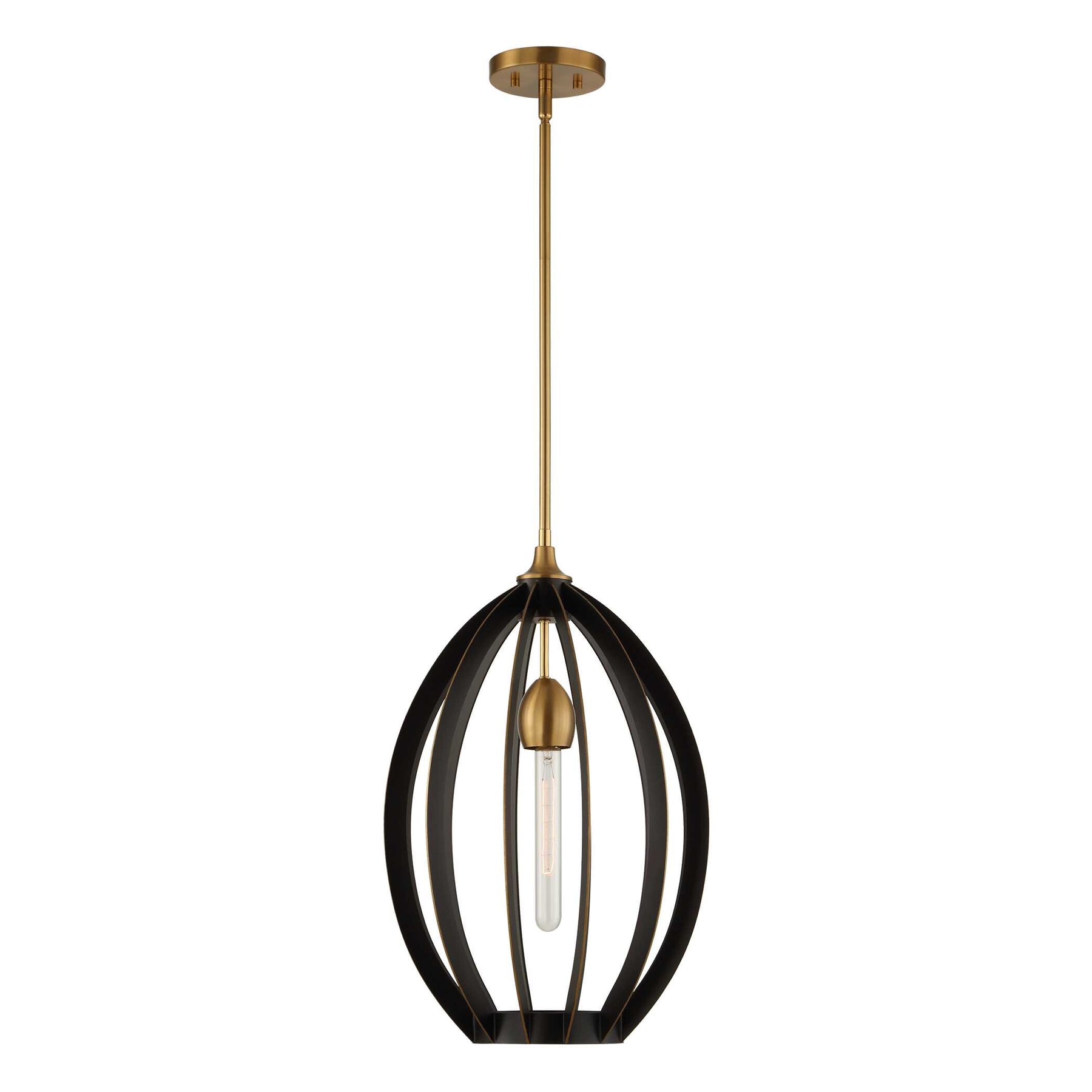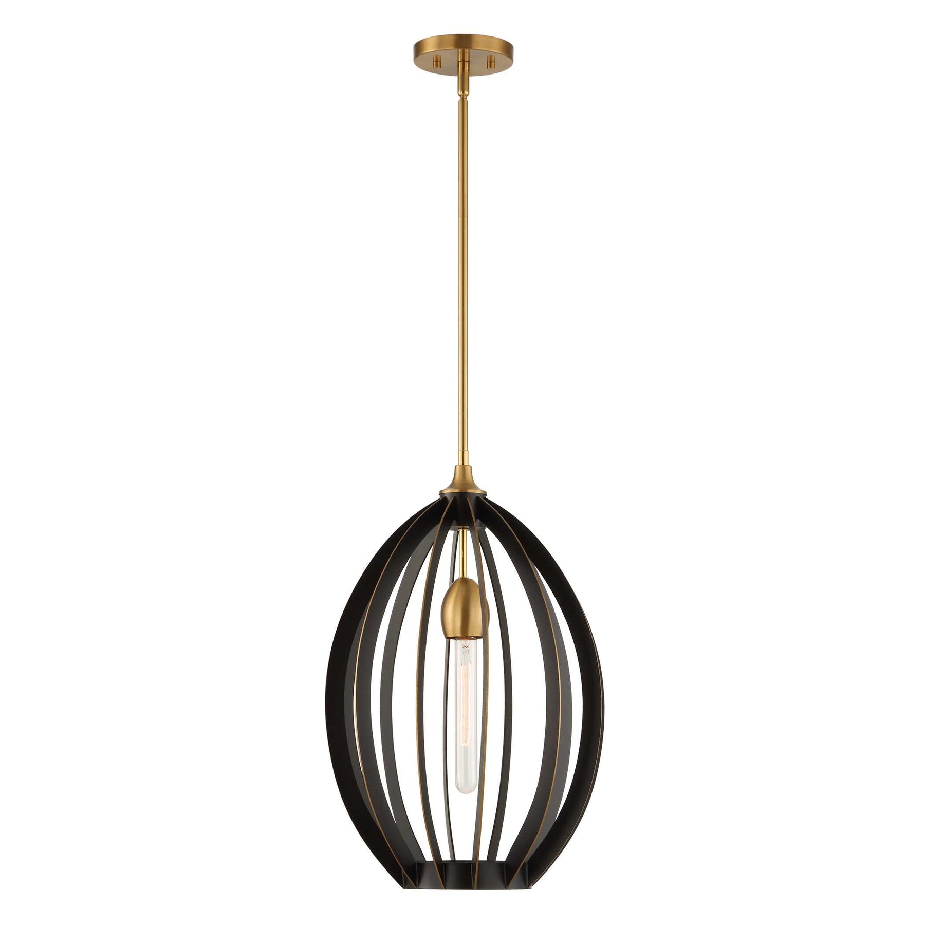 An architectural oval single-light pendant featuring linear bands in a dark bronze finish complemented by warm brass details.