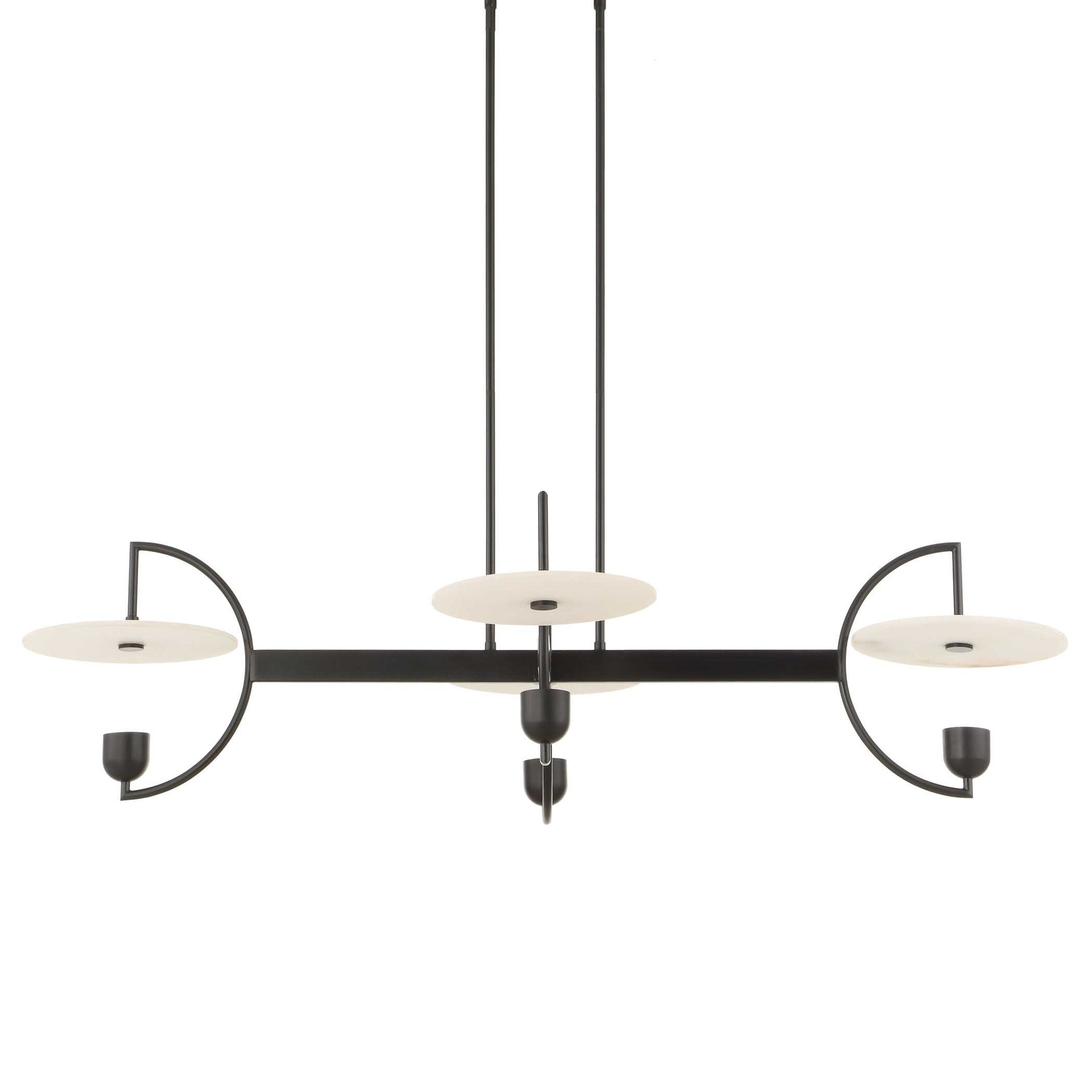 Four LED bulbs gently diffuse light through white alabaster disks, complemented by a sleek matte black frame.