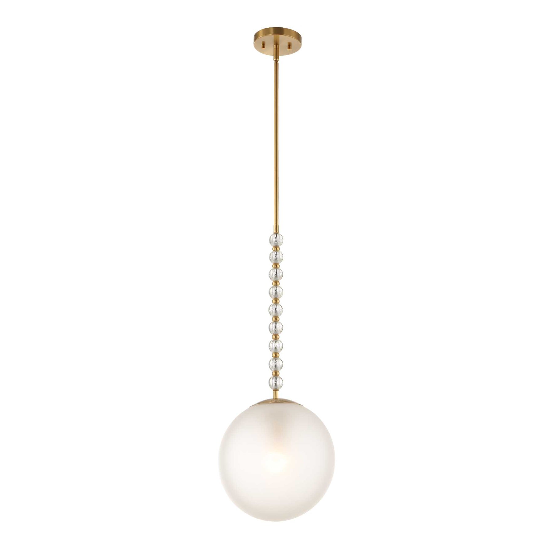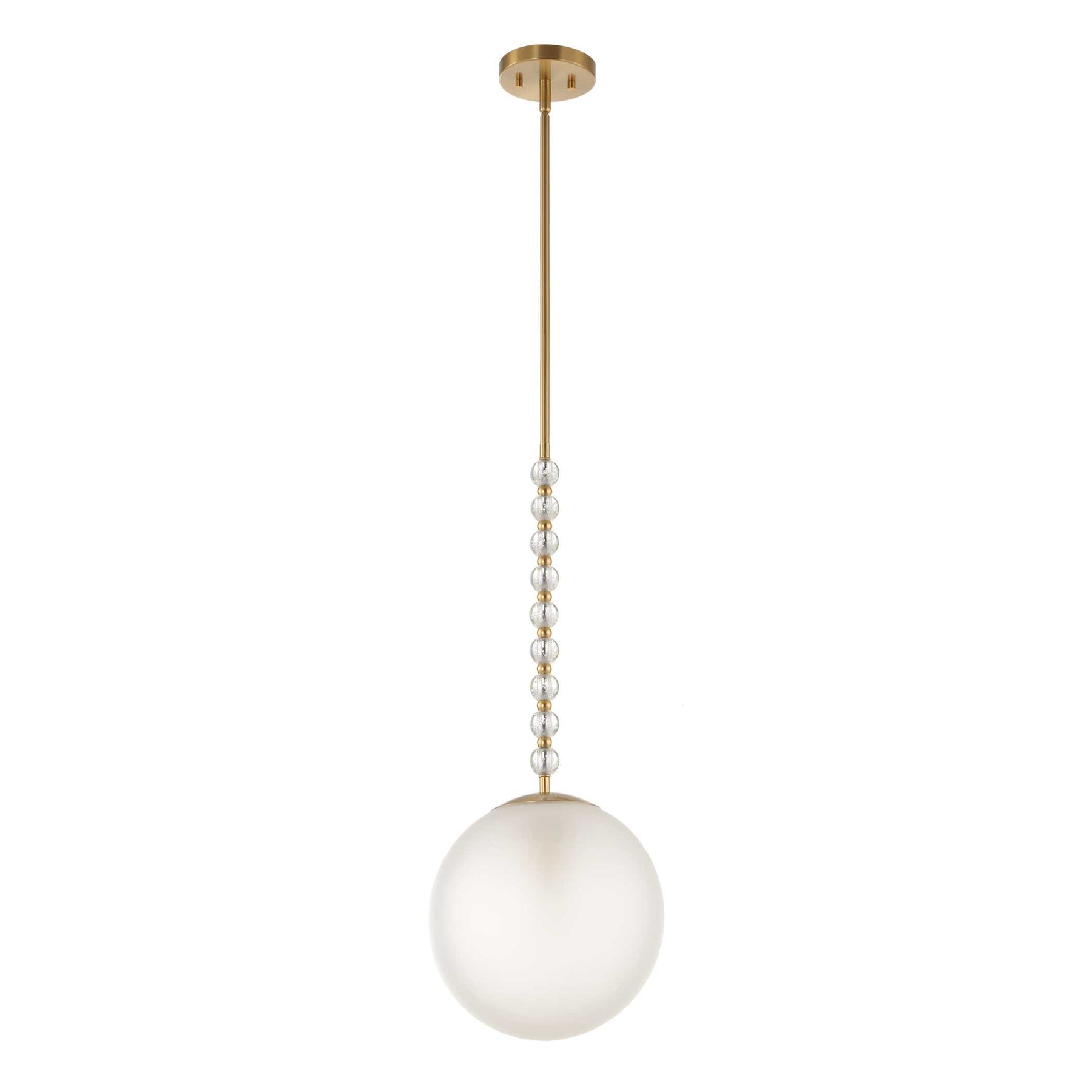This frosted glass pendant features a single light and is adorned with alternating clear glass and warm brass beads, creating a ripple effect that radiates outward.