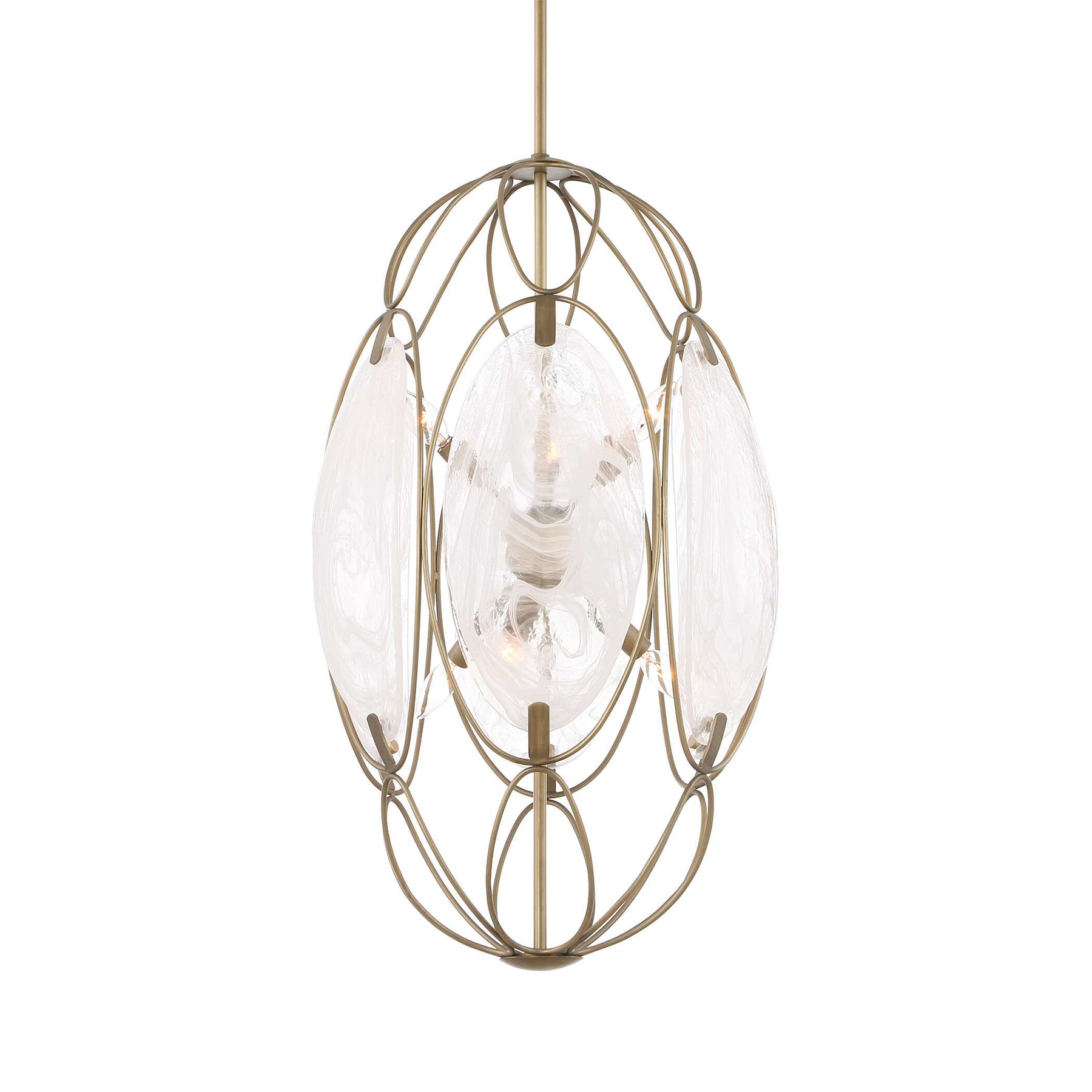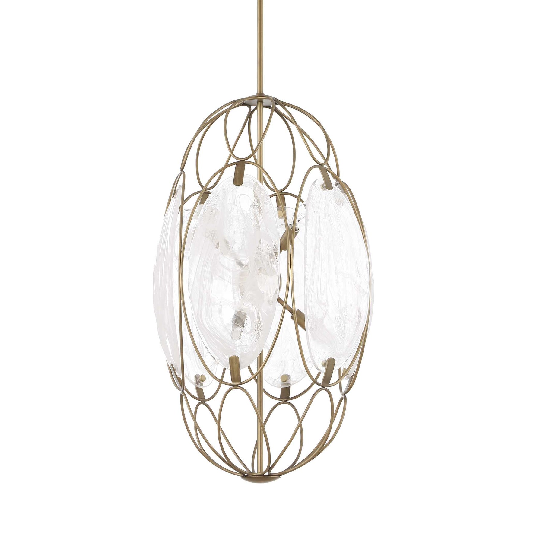 This elongated pendant features a series of linked oval shapes. The central ovals are adorned with handcrafted swirled white glass panels. A subtle gold finish adds an elegant touch to the sophisticated design.