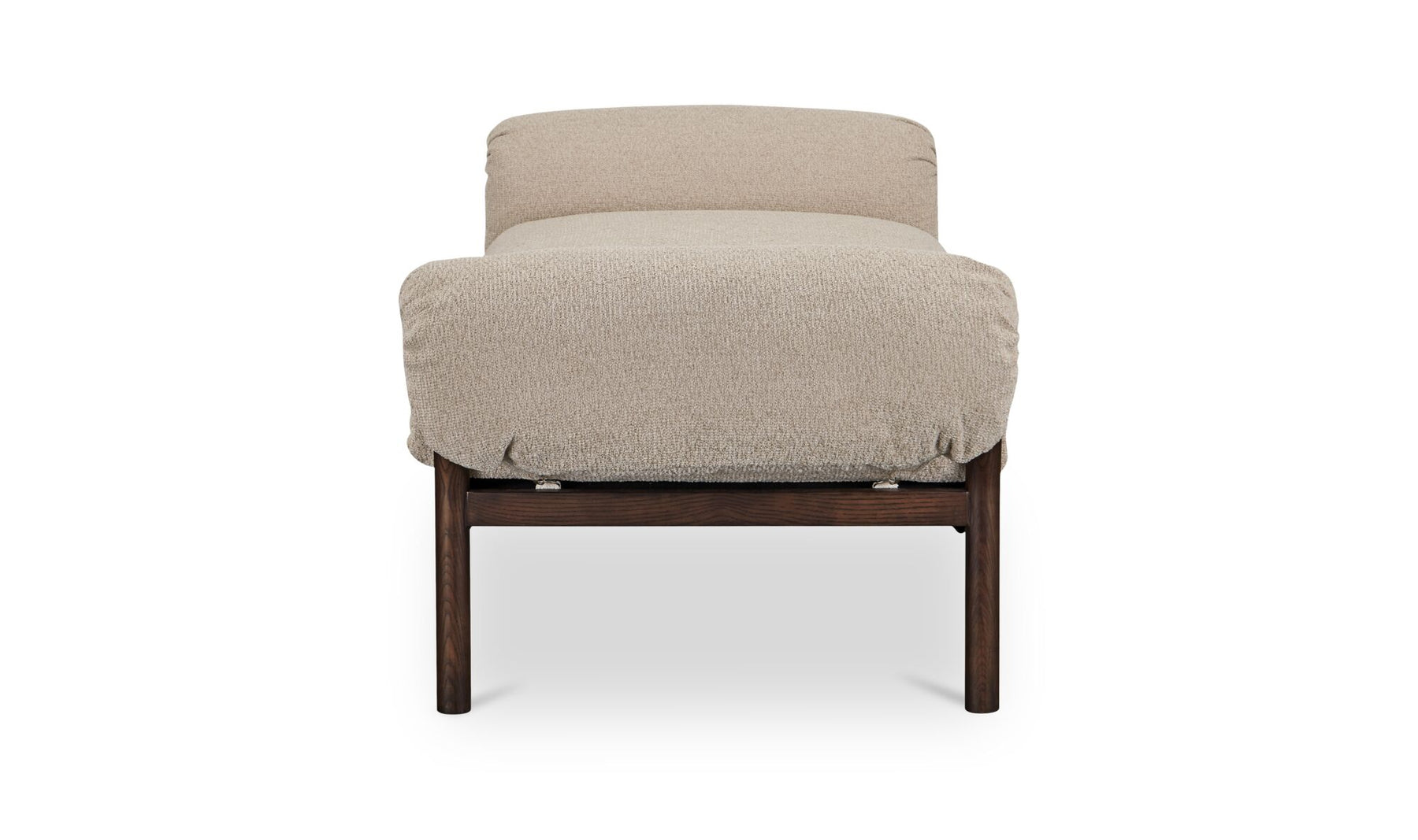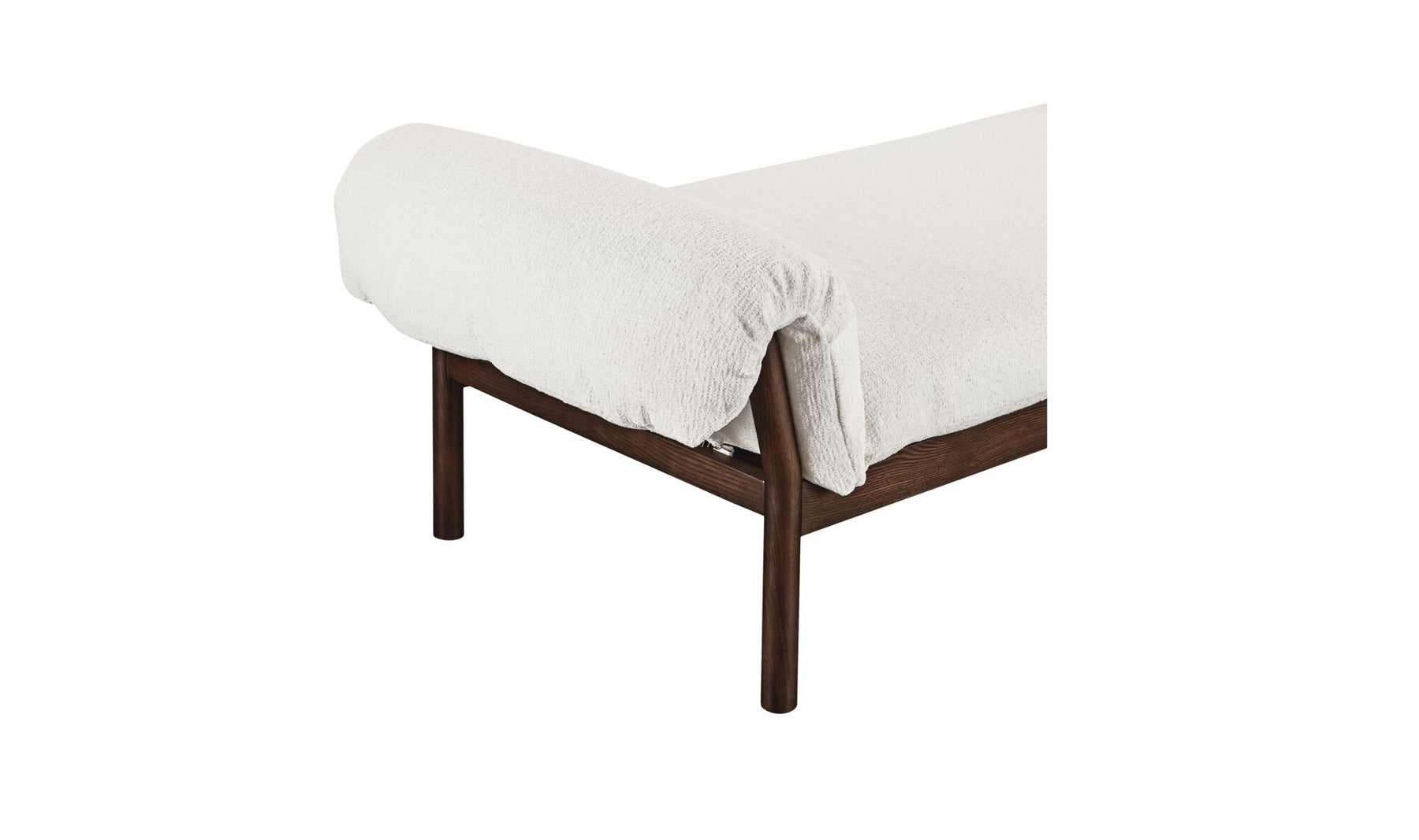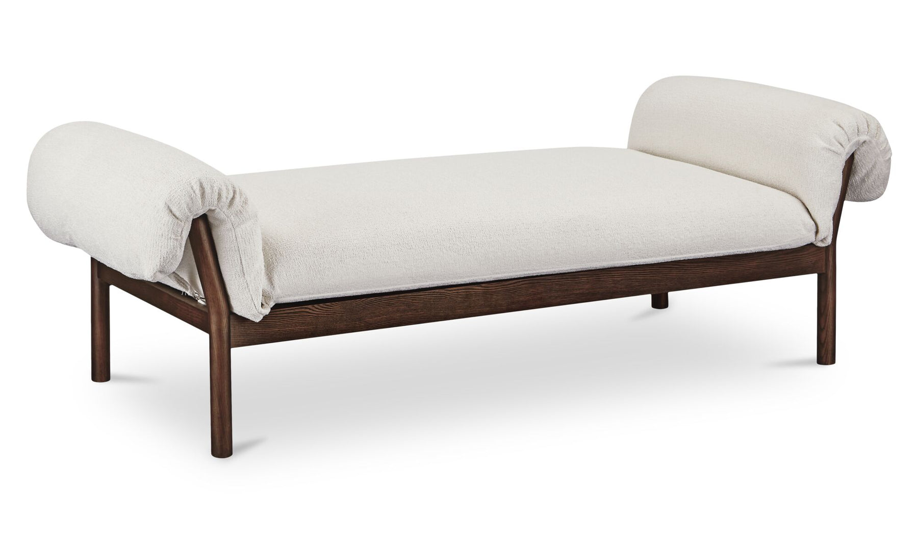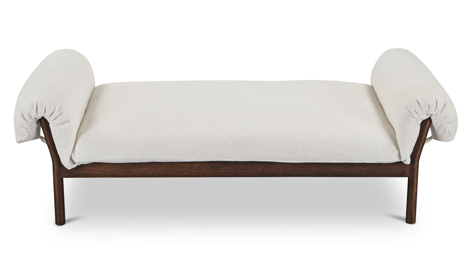 Crafted from solid ash with a deep, rich stain, the Cardero daybed bench reveals natural wood grain character throughout. Refined spindle work and gracefully curved armrests frame an expansive seat filled with premium feather and fiber for exceptional comfort. Ruched fold-over cushion details and functional ties deliver understated elegance with relaxed appeal.