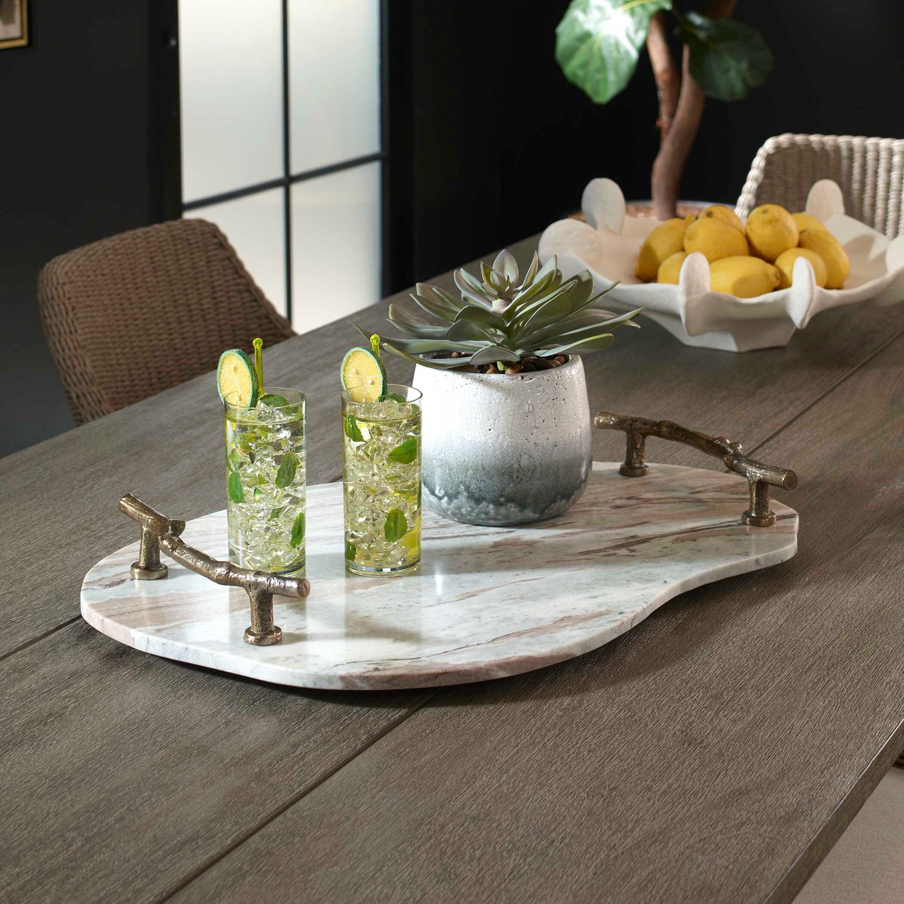 This striking tray merges natural stone with sculptural design. Hand-selected marble showcases distinctive veining in soft grays, whites, and warm rust tones, while its asymmetrical silhouette adds contemporary visual interest. Cast aluminum handles feature an organic branch-inspired design that echoes the stone's natural character. Equally at home on a coffee table or outdoor surface, the piece balances refined craftsmanship with versatile functionality.