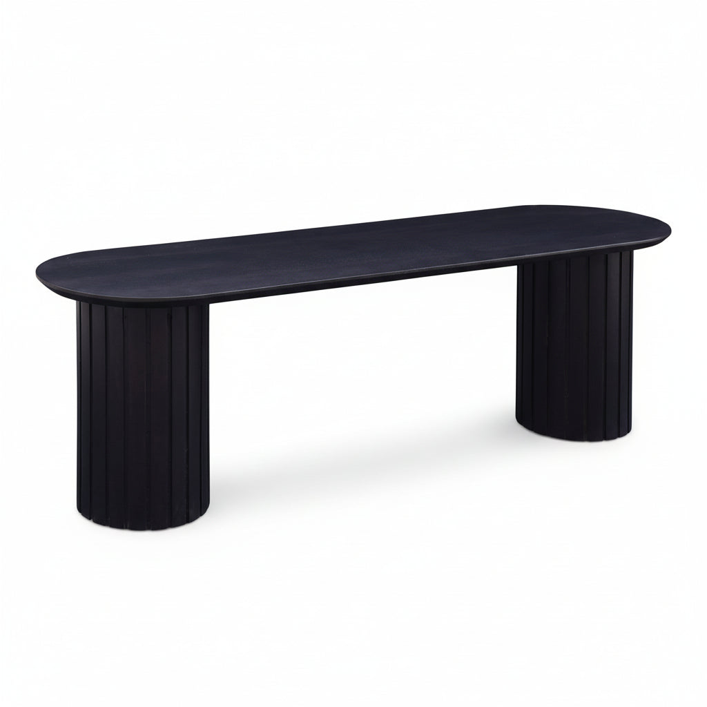 A convergence of shape and form, the Povera dining bench will serve as the pillar of your dining room. Povera features two large columns supporting an expansive tabletop, their gentle ribbing reminiscent of ripples and waves. With a rich black finish featuring a soft purple undertone that allows the natural wood grain of the Acacia wood to show through, this dining bench uses simple geometry and natural materials to form an enchanting experience. Offering bold statement appeal, Povera incorporates the elegance of ratio into your home.