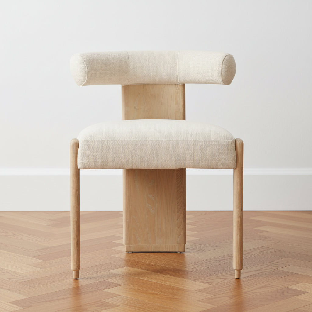 This three-leg dining chair marries contemporary geometry with organic form through its streamlined silhouette and gently curved backrest. Upholstered in cream-colored woven fabric and finished in light natural wood, it delivers understated sophistication suitable for modern dining spaces seeking both visual interest and functional elegance.