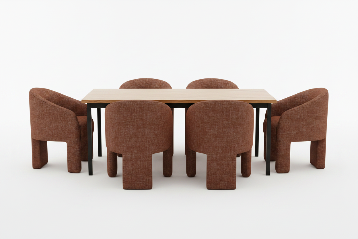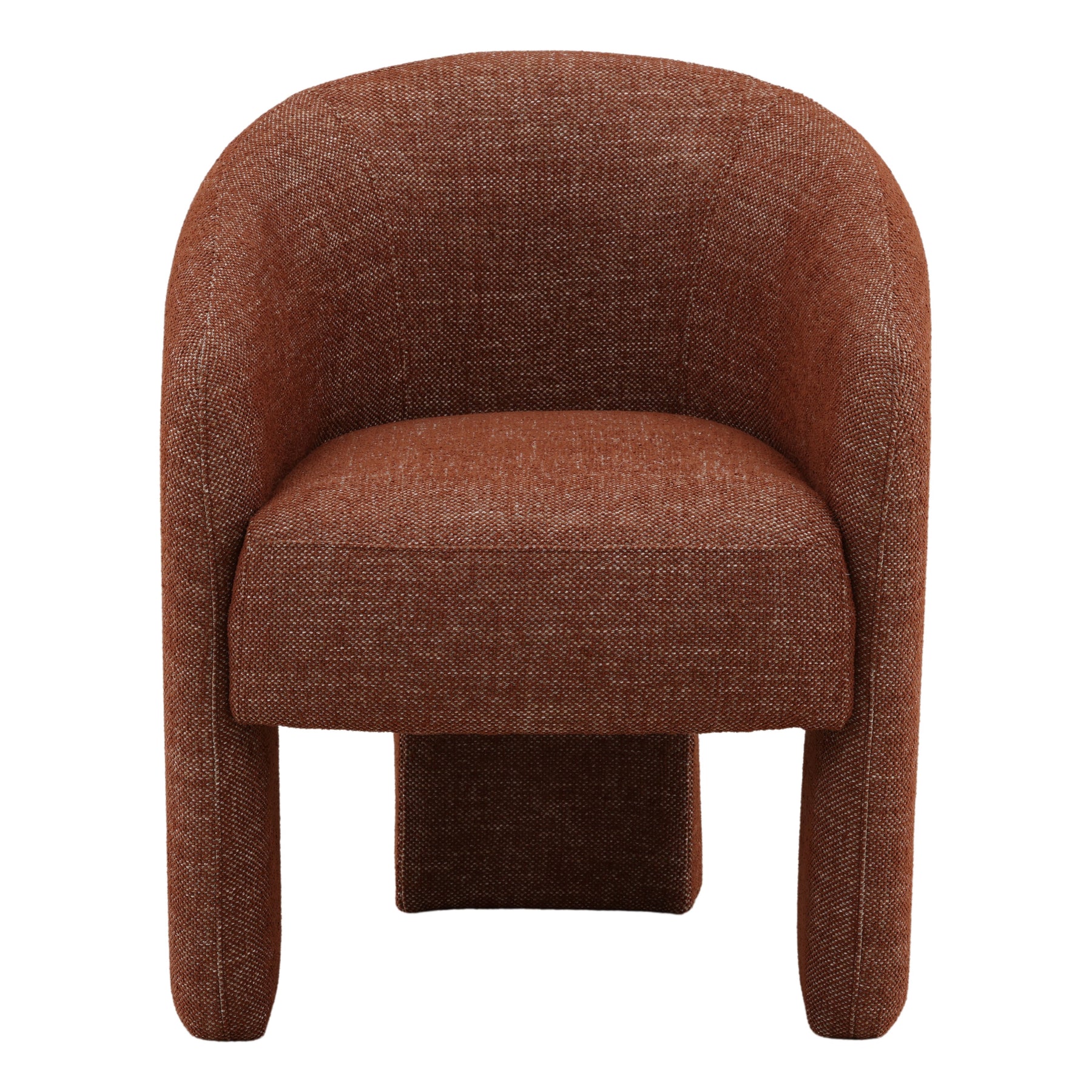 This barrel-shaped dining chair combines refined elegance with exceptional comfort, showcasing a rich rust colored basketweave fabric. A sophisticated seating solution that brings both visual interest and inviting coziness to any interior space.