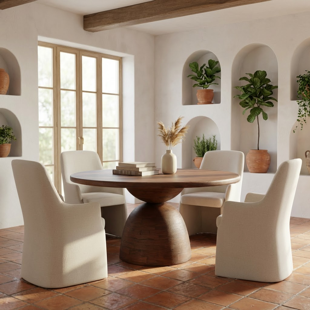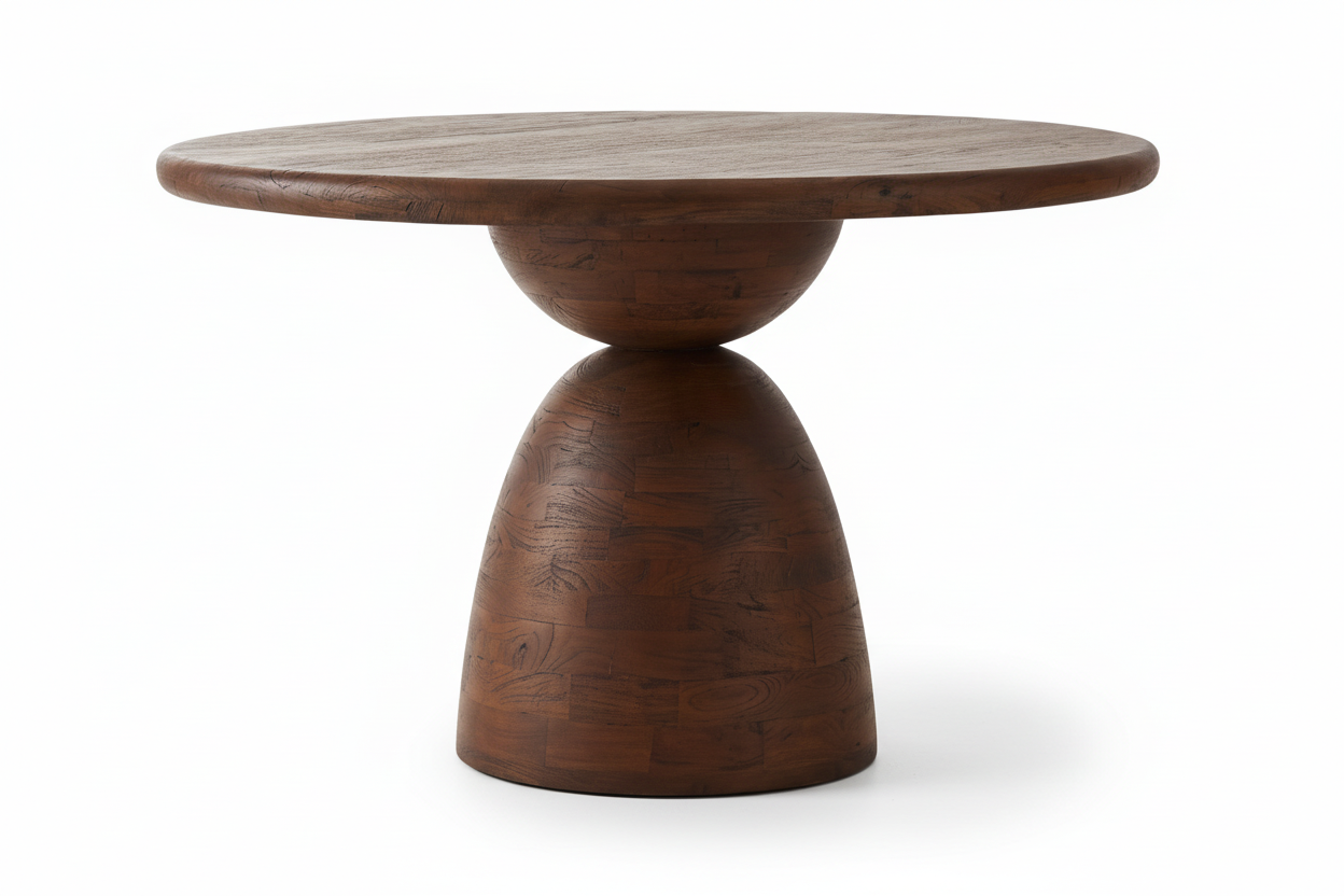 Featuring a distinctive pedestal foundation crafted from solid mango wood, this round dining table delivers both visual sophistication and practical durability. The warm brown finish enhances its natural wood character, while the sculptural base design serves as an architectural statement piece. An ideal choice for those seeking quality craftsmanship and timeless style in their dining space.