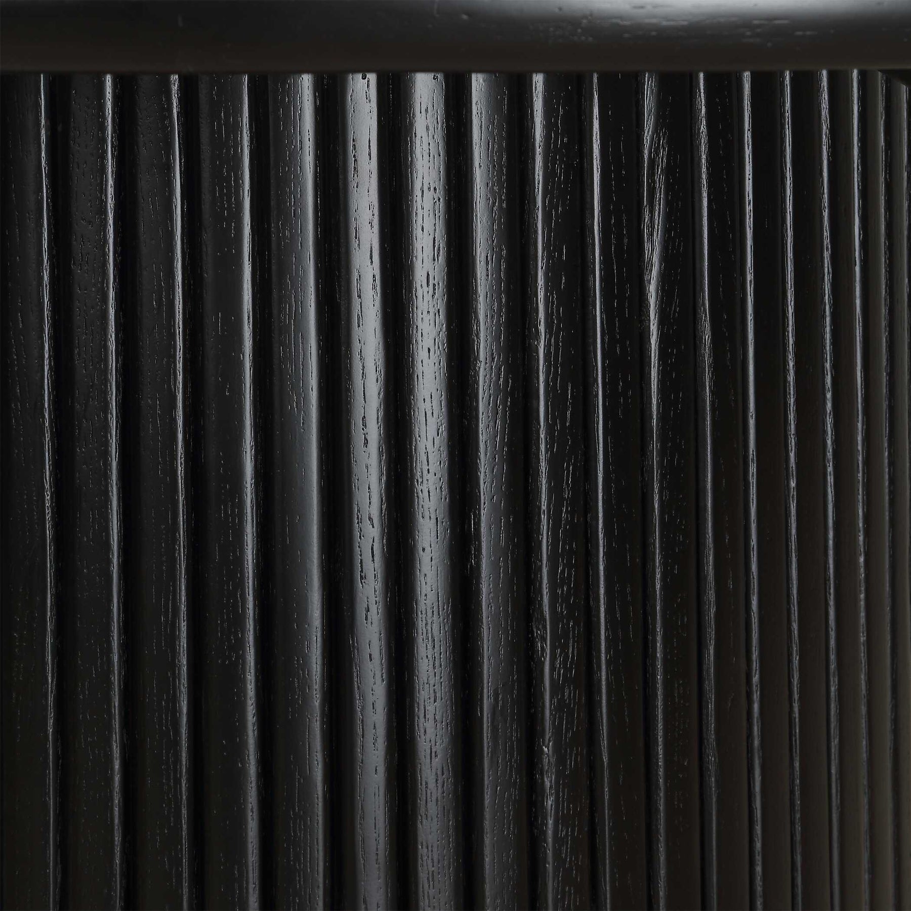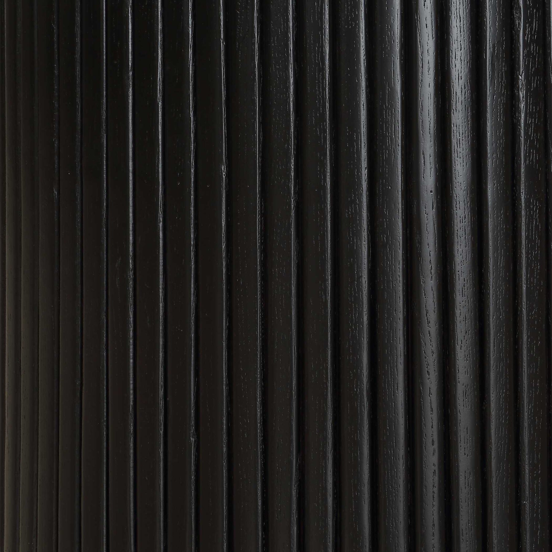 This round dining table is made mainly from solid oak wood and features a sophisticated black finish, combining modern aesthetics with sturdy construction. Its substantial fluted base leg provides a striking architectural element that elevates the table's refined appearance.