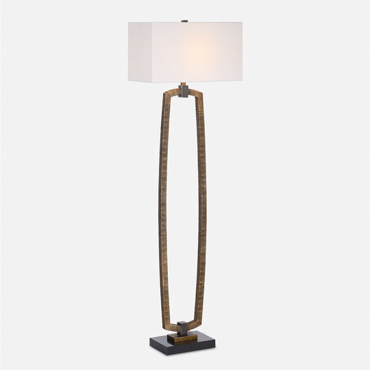 Crafted from iron and finished with plated antique brushed brass, the Branch Out Floor Lamp exudes refinement with its white marble foot. The lamp's telescoping neck allows for versatility, extending from 48" to 67" tall. Its shallow, slightly tapered hardback shade is made of white linen fabric and attaches to a pivoting stem.