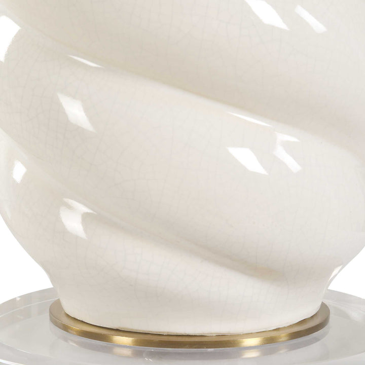 The Anneli Table Lamp showcases a glossy white ceramic base with a tapered swirl pattern, embodying classic coastal elegance. Enhanced by a crystal foot and antique brass accents, it offers a distinctive and striking aesthetic. The lamp is completed with a round hardback shade wrapped in crisp white linen fabric, delivering a refined and sophisticated lighting solution.