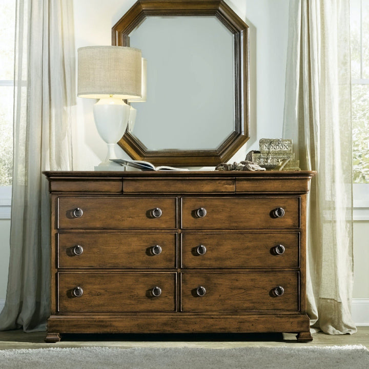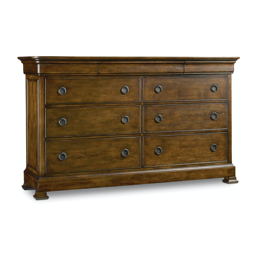 Capturing epic European and American style elements with a world-traveled pedigree, the Archivist nine-drawer dresser embraces both elegance and beloved, comfortable and simple lines inspired by authentic antiques. Crafted with Pecky Pecan Veneers, the dresser has a soft casual pecan-colored finish with a rustic feel. The finishing touch is the antique-inspired ring-pull hardware in a time-worn bronze.