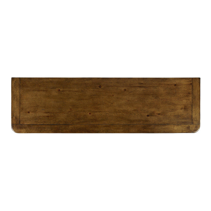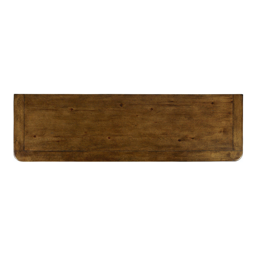 Finish: A soft casual finish over Pecky Pecan gives a rustic, character-filled and authentic look. The finish is complemented by antique-inspired hardware including kick plates, tear-drop-shaped pendants and ring pulls with back-plates in a time-worn bronze finish. Distressing includes rasping, chiseling, chain and cow-tailing.