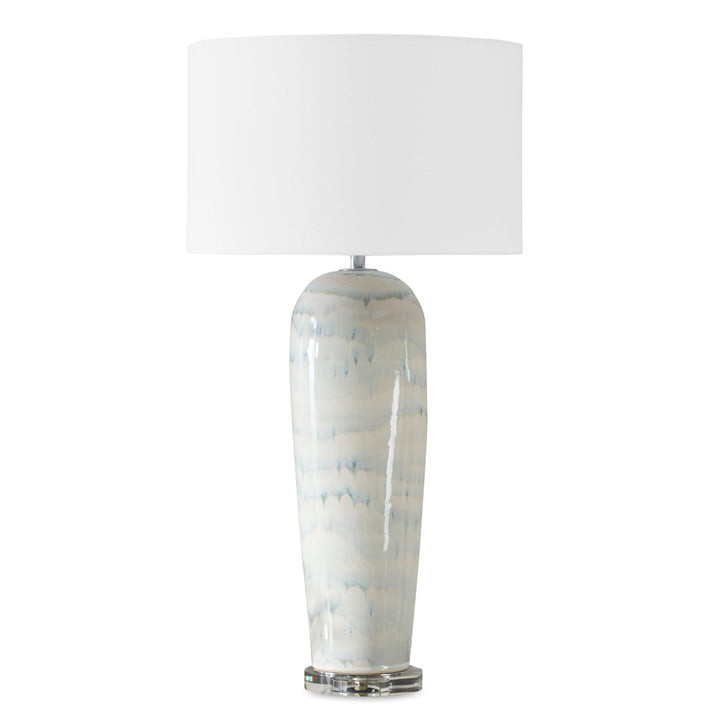 The Arden Table Lamp boasts a classic white ceramic base adorned with smoky blue glaze accents. Enhanced by a substantial crystal foot and brushed plated nickel details, it is crowned with a tapered round hardback shade in pristine white linen. Due to the unique nature of fired glazes on ceramic lamps, finishes may slightly differ.