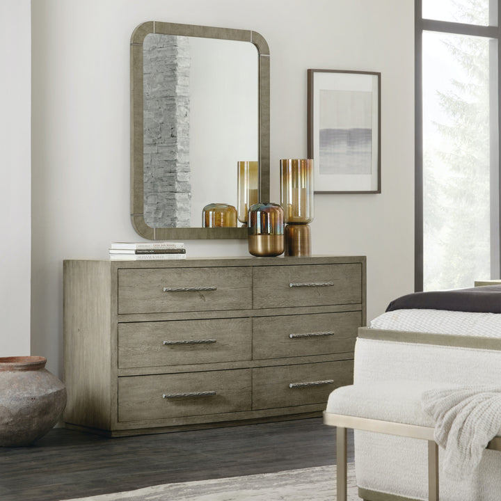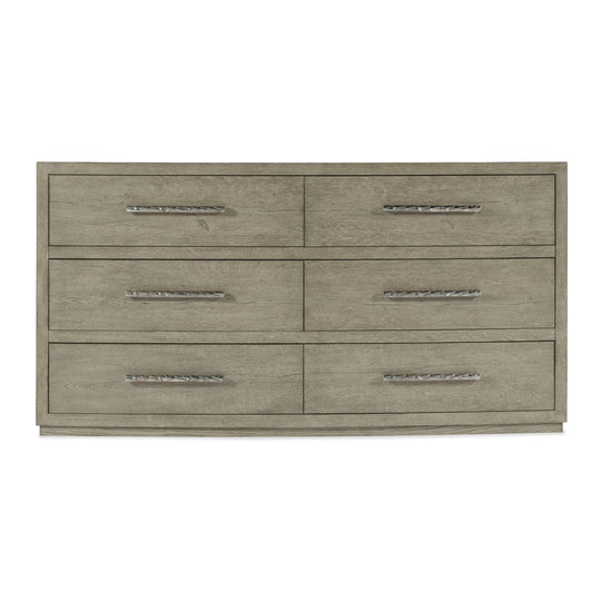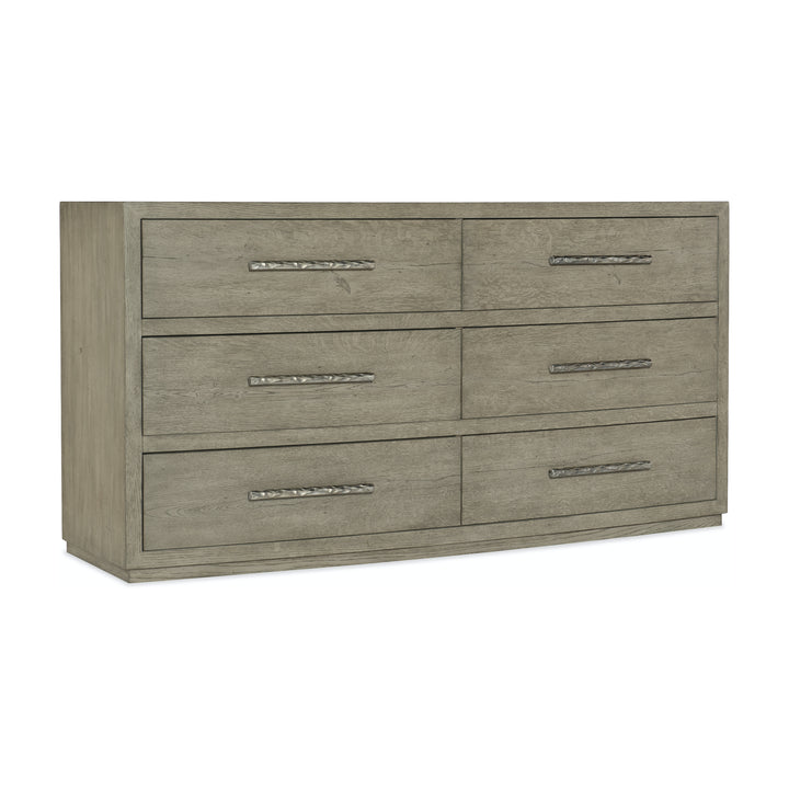 With a rustic weathered finish and clean modern lines, the Ashford Dresser has six self-closing drawers, with the top two drawer featuring drop-in felt liners and a jewelry tray. The bottom two drawers are cedar lined. Crafted of Oak Veneers, the dresser is finished in the soft smoked gray Mink. Textured metal bar pulls in an antique pewter finish add an organic accent.