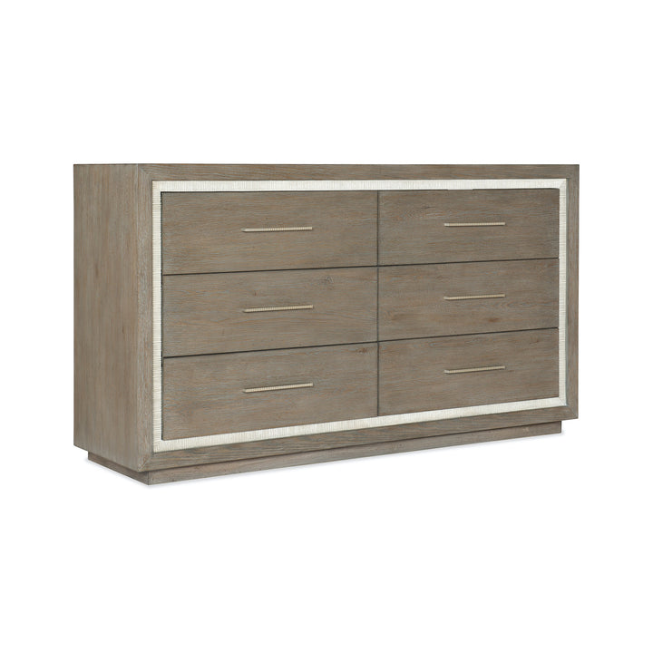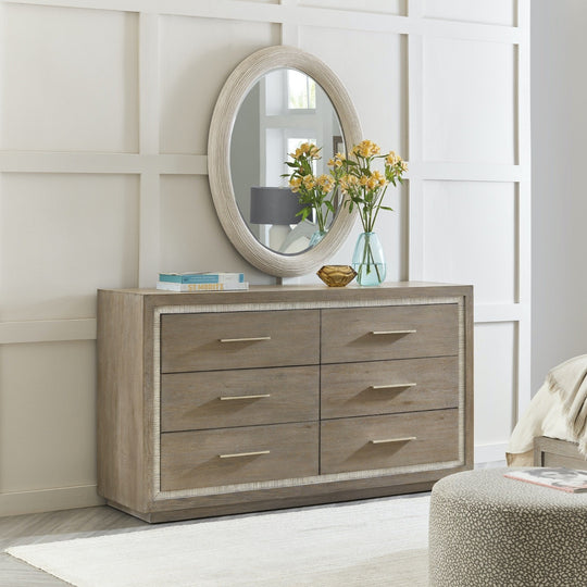 In a crisp two-tone finish combining a gray washed oak with a contrasting textured light gray color, the Serenity Mainstay Dresser brings the organic textures of cottage waterfront living to your space. Crafted of Oak Veneers and Resin with Cedar, there are six soft-close drawers with soft-close drawer guides and the top left drawer offers a removable black felt liner. The top right drawer has a removable black felt liner and sliding/removable black felt jewelry tray. The bottom drawers are cedar-lined.