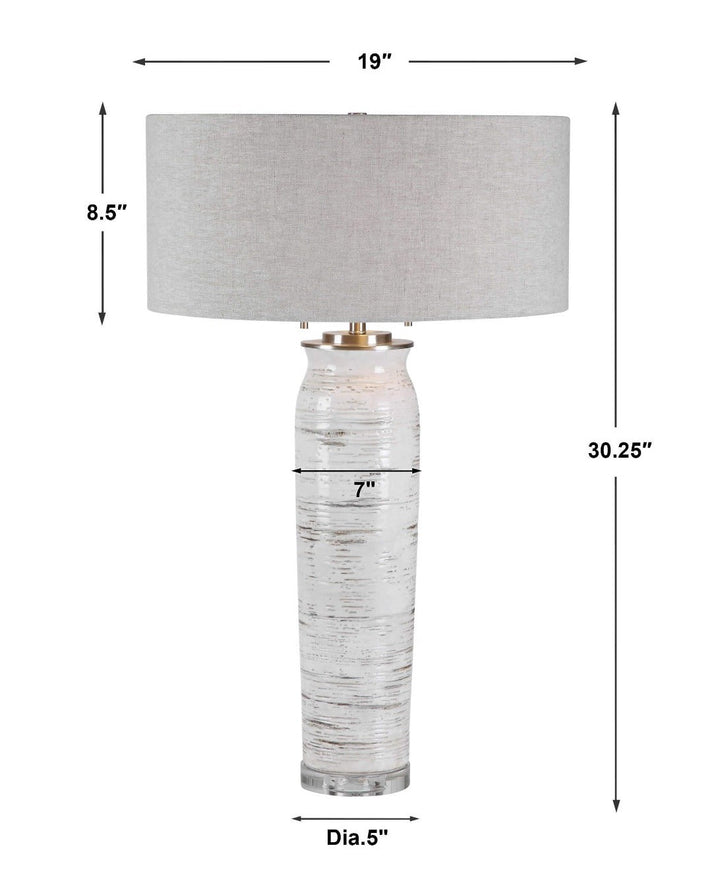 Inspired by the bark of a birch tree, this table lamp features a ceramic base finished in off-white with rust colored accents and noticeable texture and distressing. The piece also has a crystal foot and brushed nickel details. The round hardback shade is a light oatmeal linen fabric with slubbing.