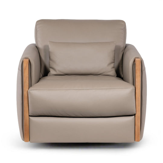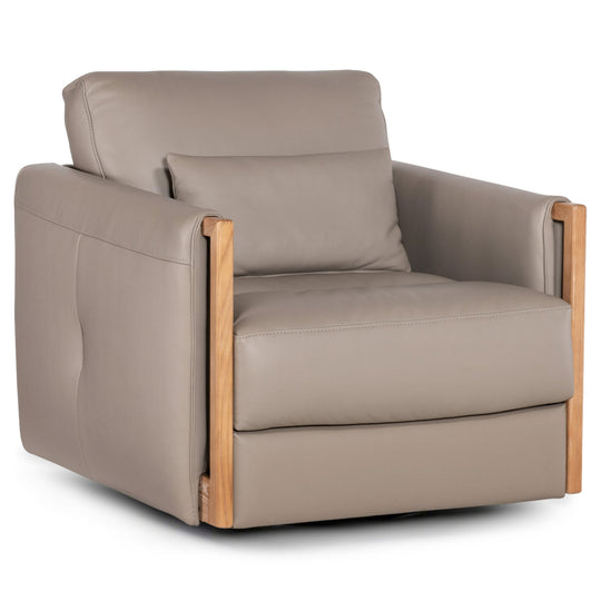 The Dion Swivel Chair combines chic style with practical comfort. Truffle Grey Leather upholstery, matching kidney pillow, exposed wood trim, and smooth swivel motion are perfect adding plush sophistication to modern living.