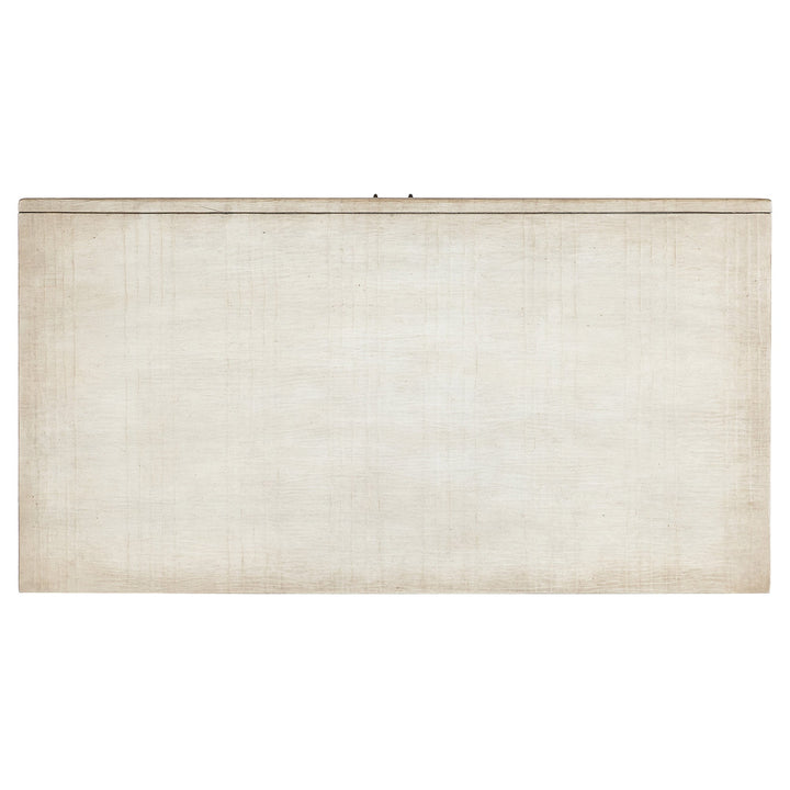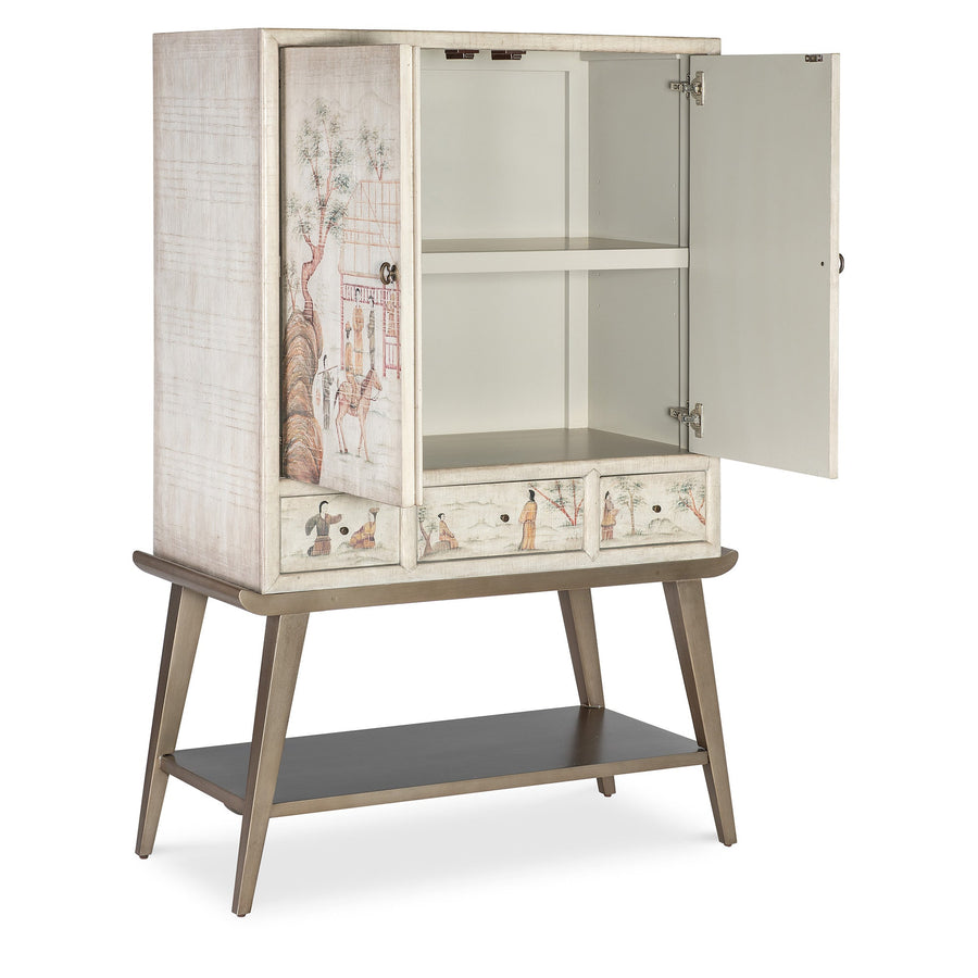 The Dynasty Accent Chest features ancient Asian-inspired designs, a tactile Canvas Crackle finish, and soft-close doors and drawers for functional elegance.