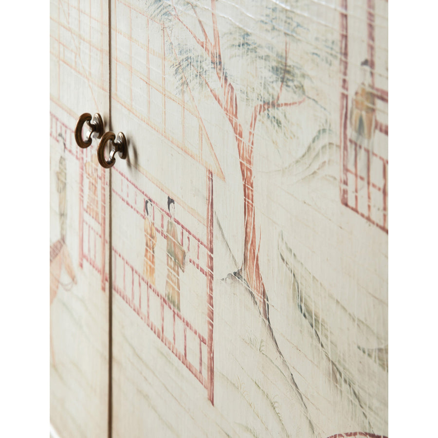 • Finish : Soft white and beige linen crackle canvas color with gold base, legs and shelf. Asian painted motif using red, brown and green colors.