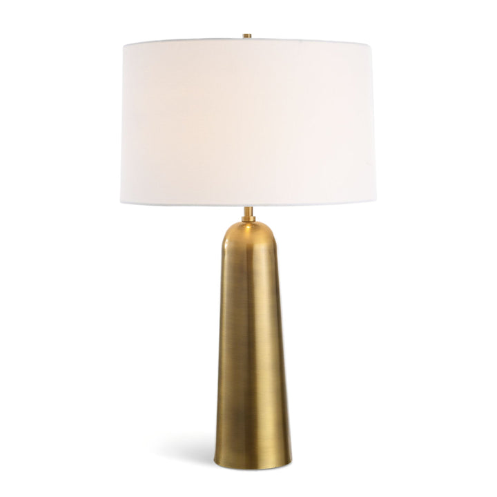 Made entirely of iron and featuring a plated antique brass finish, the Flinchem Table Lamp adds a cozy touch of luxury to any room. Its round, slightly tapered hardback shade is covered in crisp white linen fabric for a clean and sophisticated look.