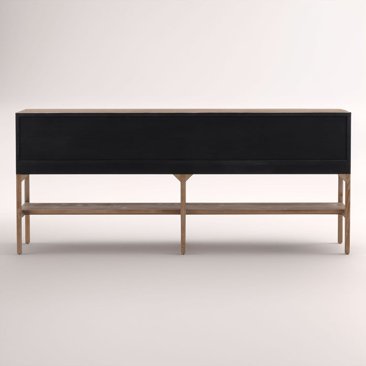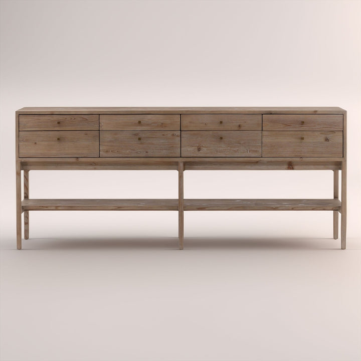 Add rustic charm to your media room, dining area, or entryway with this simply styled natural pine wood console credenza. Bronzed iron hardware add a modern touch, while the eight drawers and lower shelving provide ample storage.