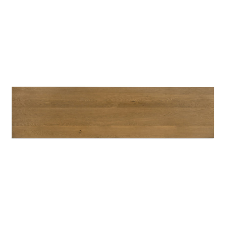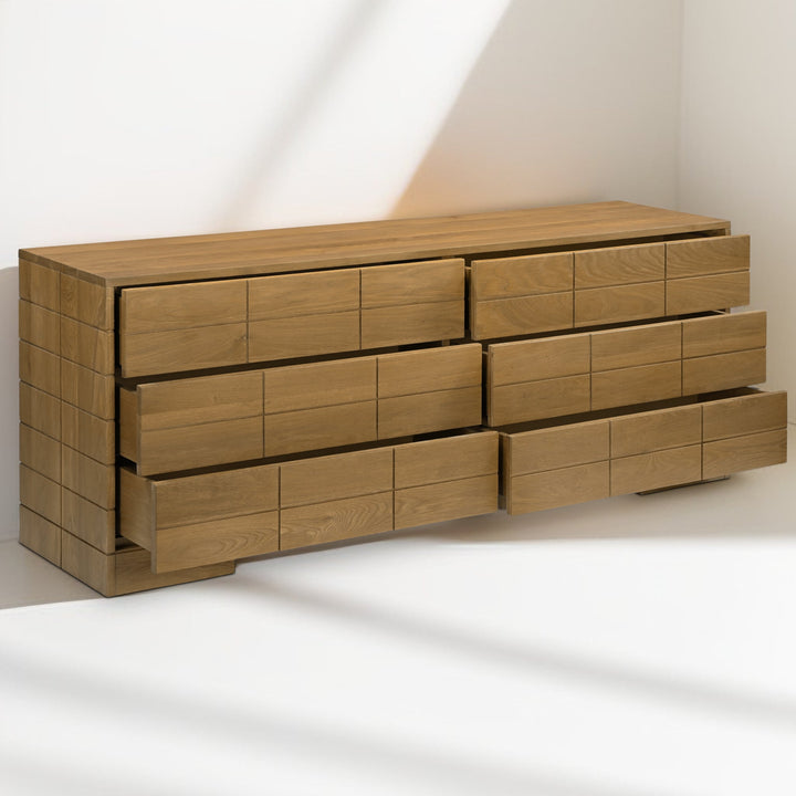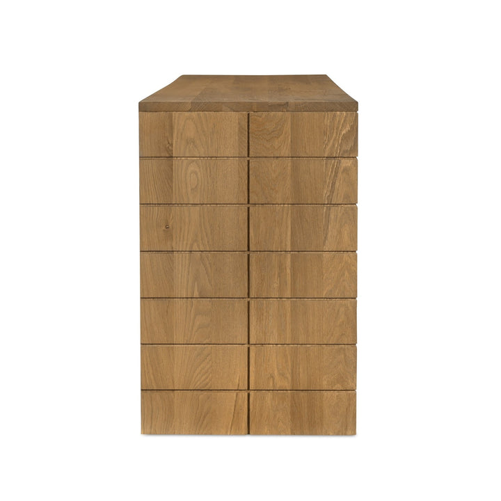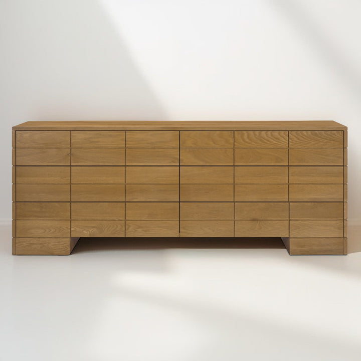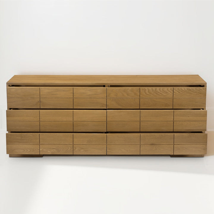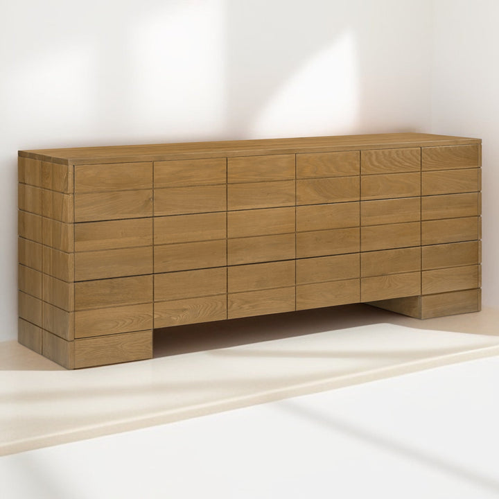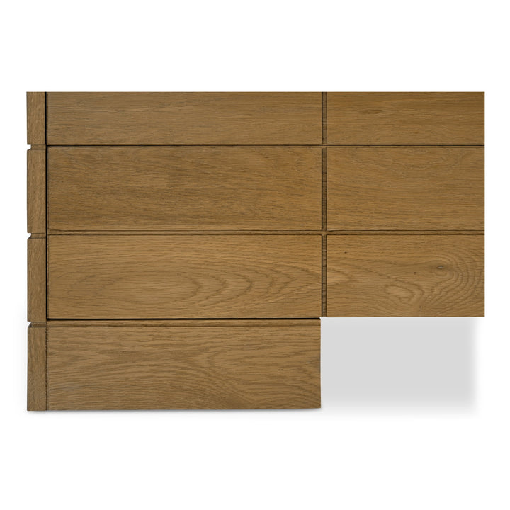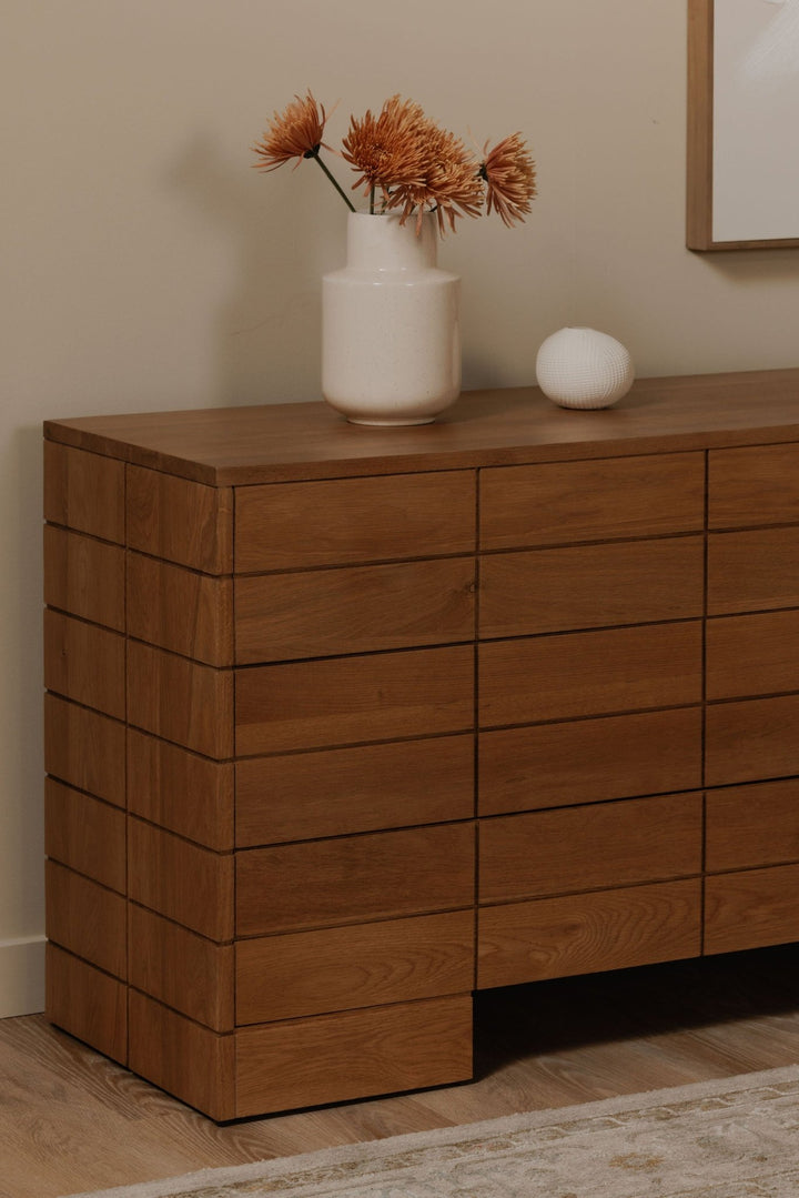 The Gia dresser's mid-tone brown oak finish is complemented by its distinctive geometric design, making it a versatile and elegant addition to any interior. Its uniform drawers, all of the same size, offer a sleek and lightweight appearance.