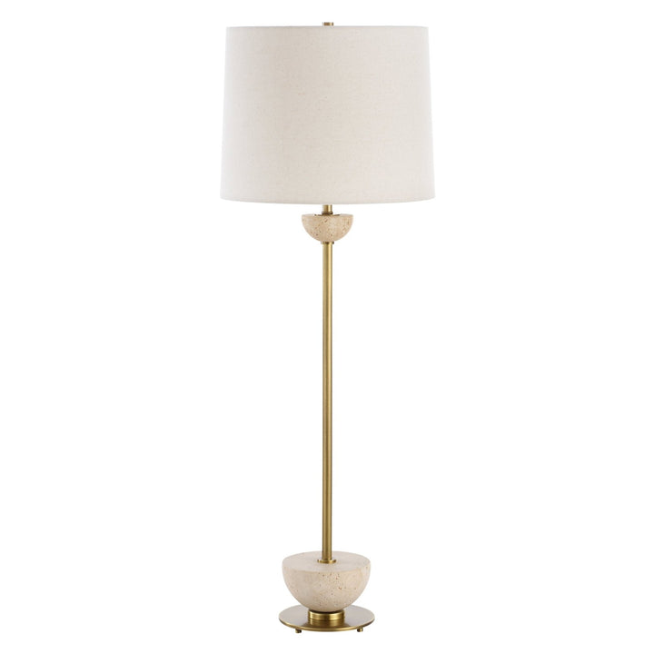 The Hemisphere Buffet Lamp features a polished brass base complemented by two travertine half spheres on either end, lending a touch of sophistication. The round hardback shade has a slight taper and is covered in light slubbing oatmeal linen fabric.