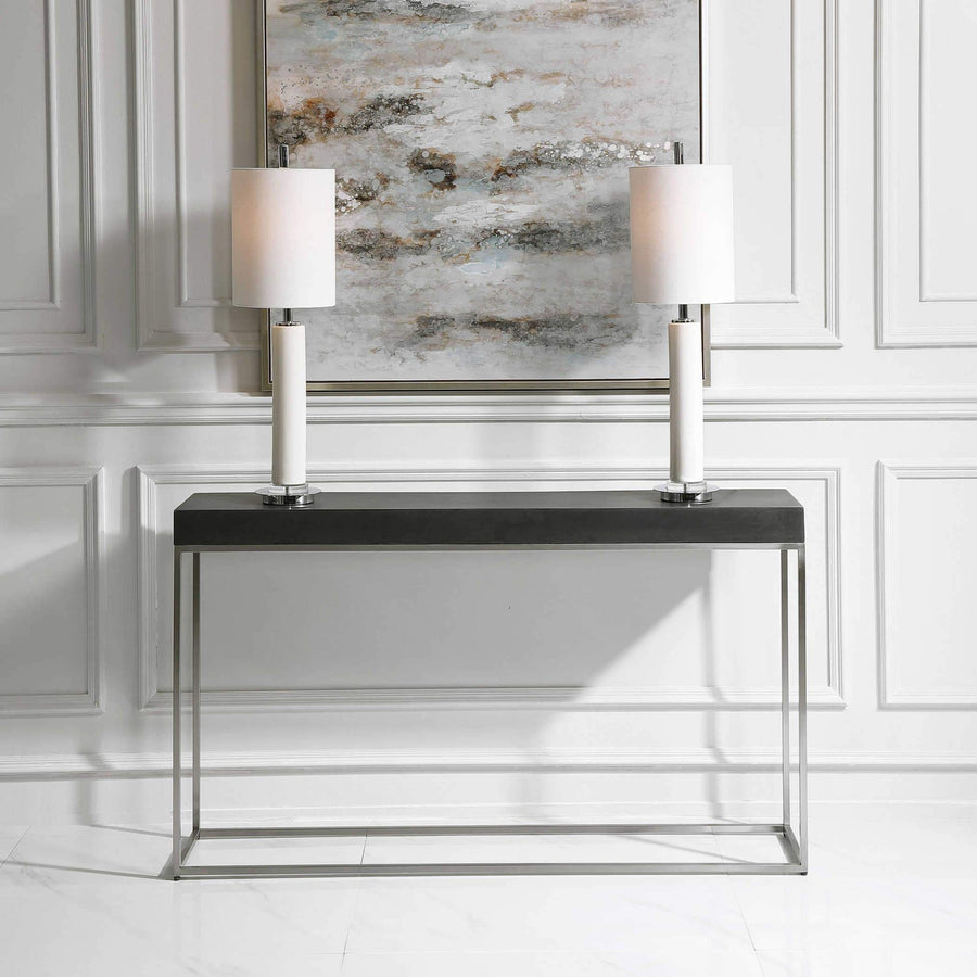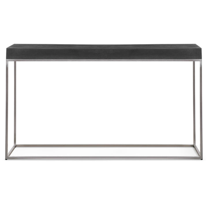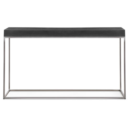 Sleek and contemporary, this console table features a black concrete look atop a brushed nickel stainless steel base.