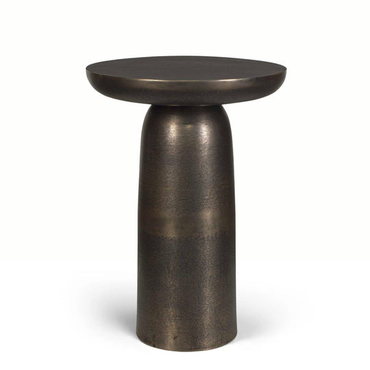 This distinctive accent table features a sculptural design made from cast aluminum. Its base showcases an organic shape with a sandy texture, complemented by a rich golden dark bronze finish, delivering a visually compelling statement piece.