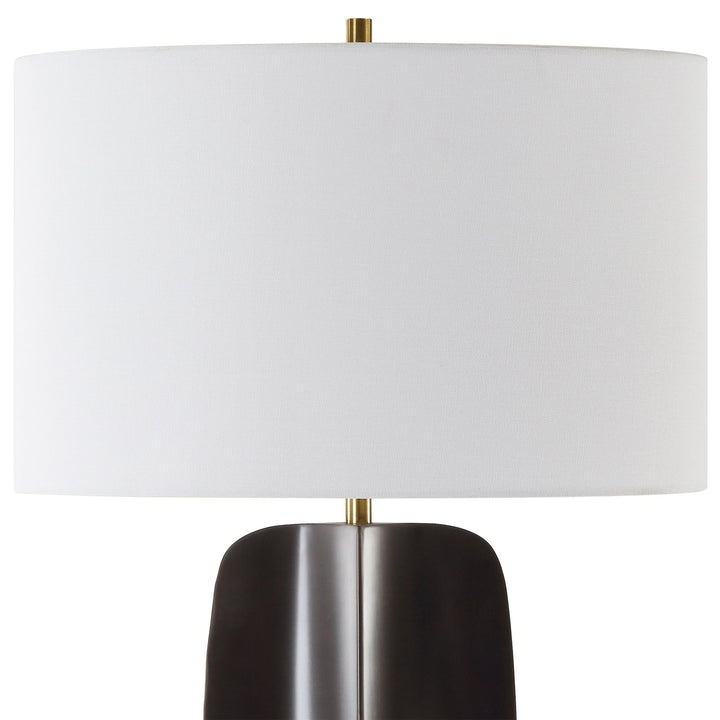 Crafted from hand forged iron and plated brass columns, the Kure Black Table Lamp replicates a tribal sculpture and features a thick travertine foot. The oval hardback shade, covered in a white linen fabric, adds a touch of elegance to this unique piece.